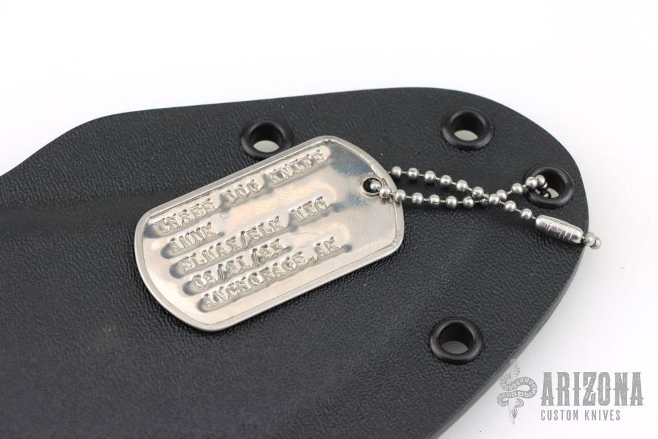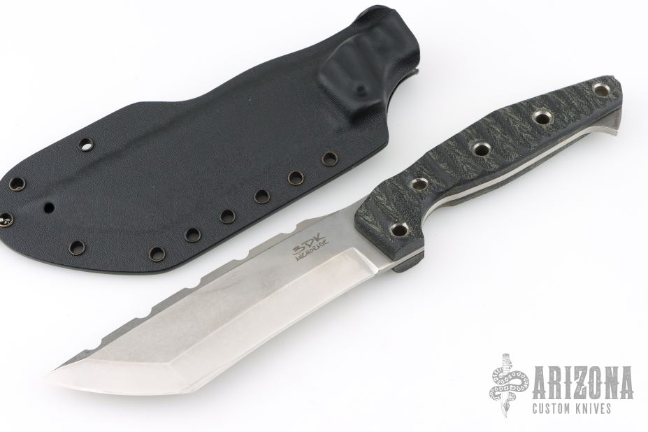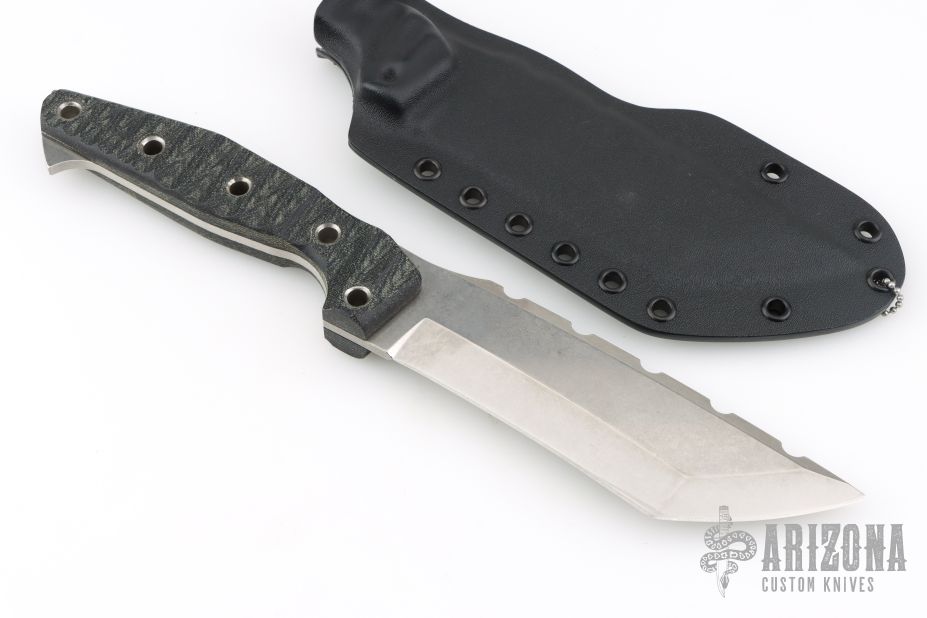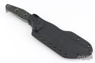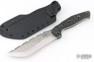 This AMUK by 3 Dog Knives features a stonewashed tanto blade with notched spine and false top edge, .175" blade stock and 1.847" blade depth. The handle has Chugach Mountain Textured black canvas micarta scales with hollow pins over full tang construction. Includes kydex sheath with original dogtag dated 2/21/23. Excellent condition.
