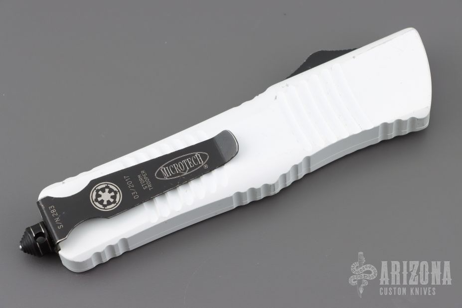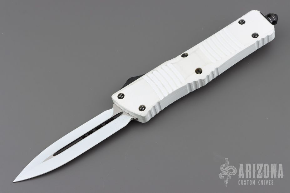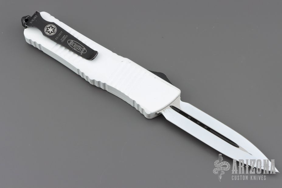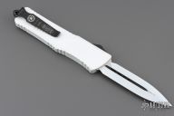 This Combat Troodon OTF automatic by Microtech knives features a white double edged blade, and a white aluminum handle with black hardware, tip down carry. Glass breaker. S/N 283. Dated 03/2017. Has scuffs, scratches and some marks on the clip. Good condition otherwise; great user condition.