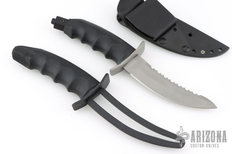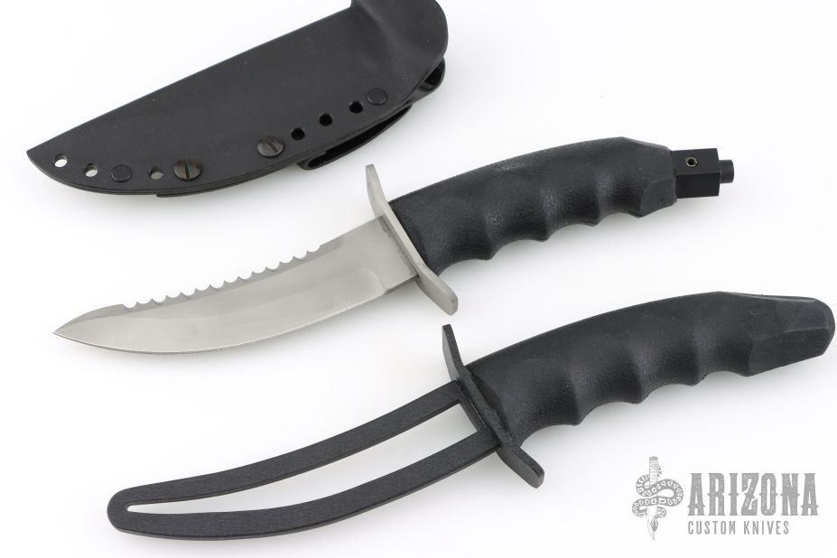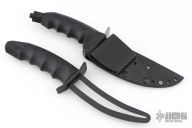 This Hobbit Warrior by REKAT features a bead blasted blade with .157" blade stock. 1.201" blade depth. Serrated top edge. Double bead blasted guard. Rubber handle. Black coated butt cap. Comes with kydex sheath with belt loop. Comes with a matching trainer. Has a few light scuffs, otherwise excellent condition.