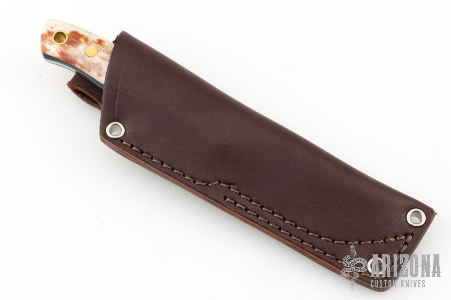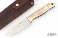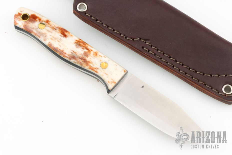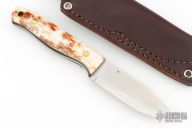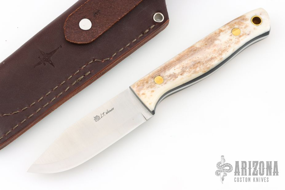 This knife by LT Wright features a satin finished scandi ground blade with .120" blade stock and 1.084" blade depth, full tang construction. The handle has brown bone scales with brass pins and black liners. Comes with brown leather sheath. Has a couple light scuffs, Excellent condition.