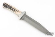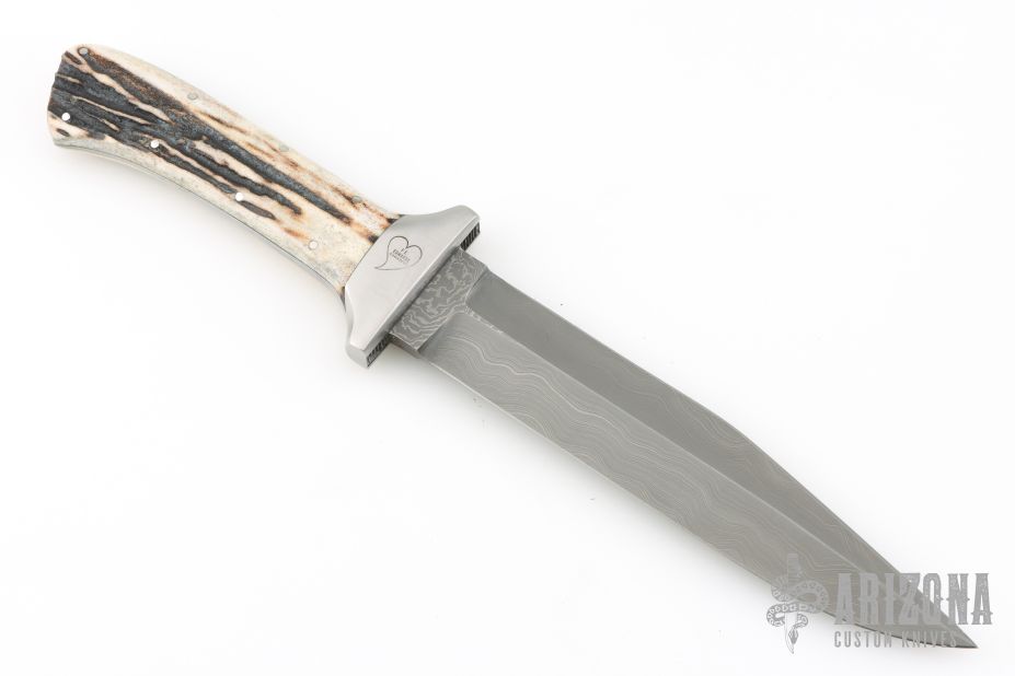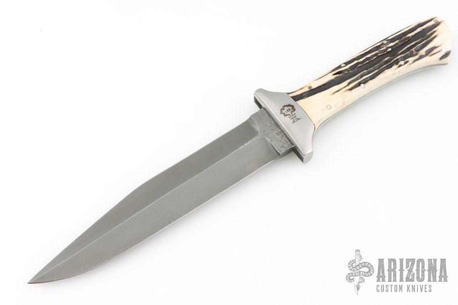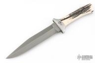 This fighter by Lee Bench Made Knives features an F.E. Edwards Damascus blade with sharpened top edge, .266" blade stock and 1.237" blade depth, full tapered tang construction. The handle has satin finished stainless steel dovetailed bolsters, stag scales with stainless steel pins. Comes with a zippered case. Has a few light scratches, otherwise excellent condition. Comes with original sales receipt dated Sept, 7 1984
