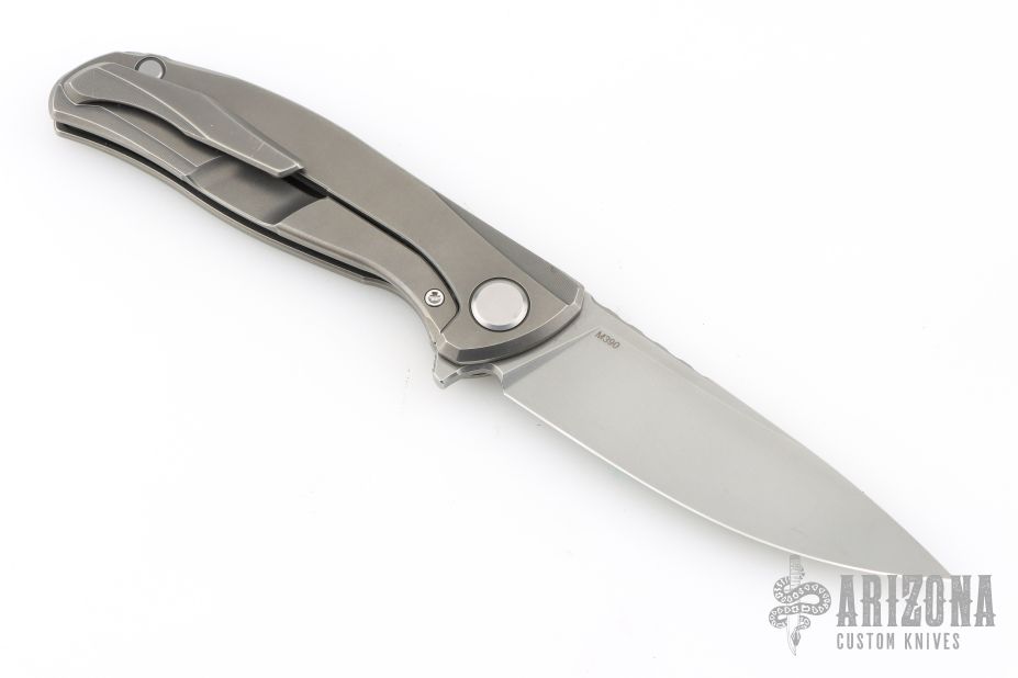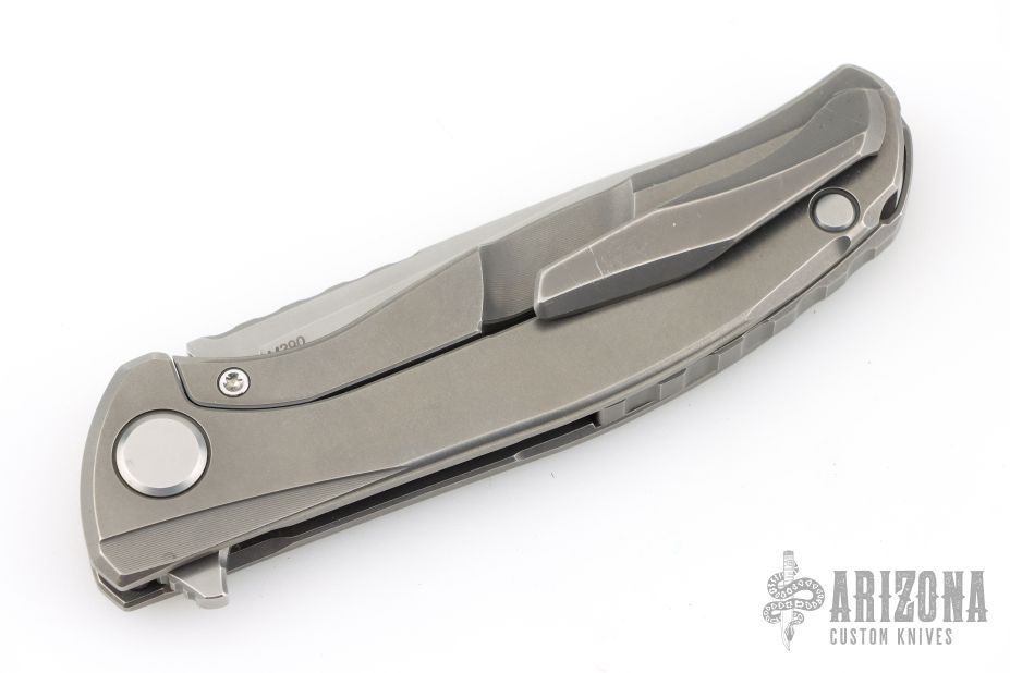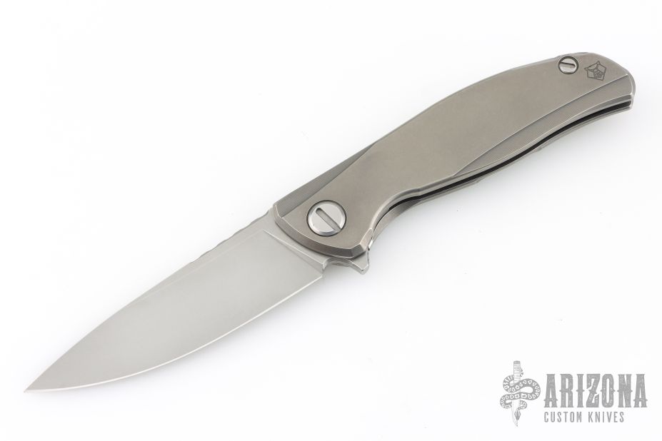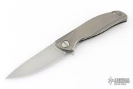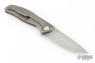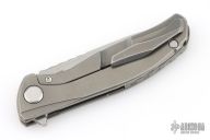 This Model 95 Zero framelock flipper from Shirogorov has a flat ground and tumbled blade with a milled and tumbled titanium frame with matching tip up clip. Excellent lockup, crisp detent, and perfect seating. Comes with original box and papers. Has a couple scratches, otherwise excellent condition.