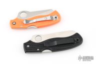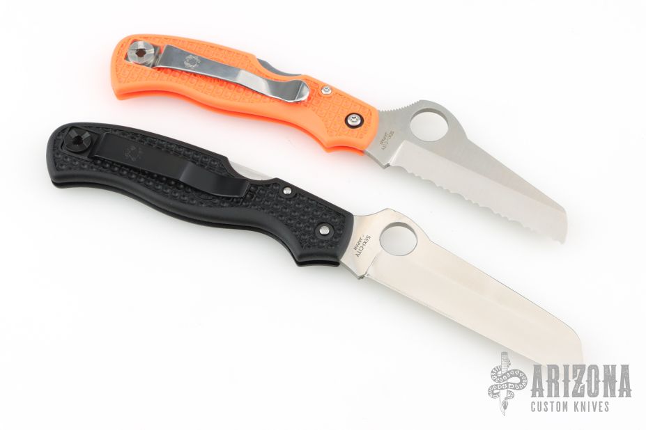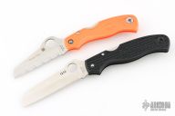 This C45SOR Rescue Jr. from Spyderco features a VG10 sheepsfoot style satin finish blade with thumb hole and serrations. The handle is comprised of textured orange FRN over stainless steel lock back. Reversible steel clip positioned for tip up carry. Includes original box. Has a couple light scuffs, otherwise Excellent condition. 1.9oz 3"BL7.125"OAL4"CL