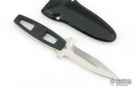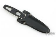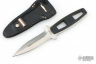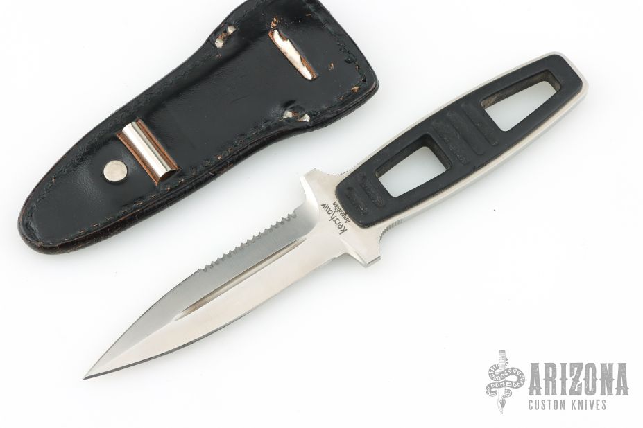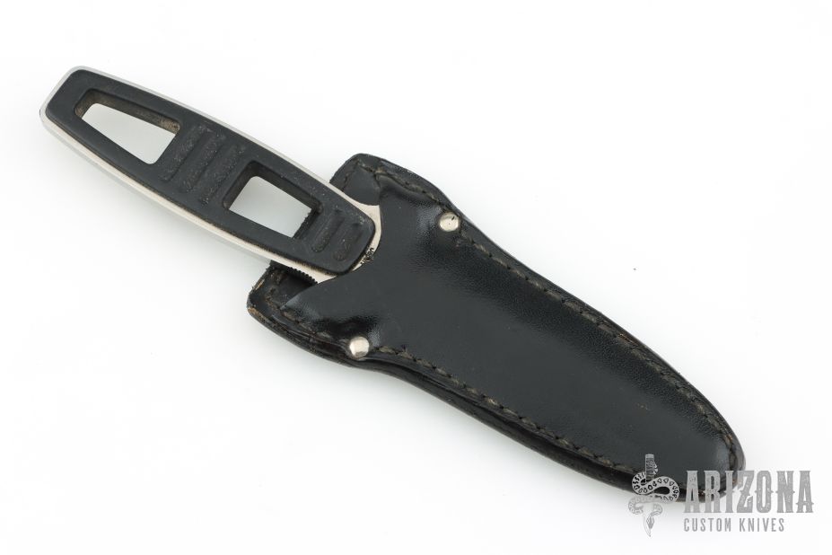This Amphibian Dive Knife by Kershaw Knives has a satin finished double-edged dagger with fullers and partial serrations, .147" blade stock and .901" blade depth, full tang construction. The handle has black scales. Comes with original black leather sheath. Has some scratches, otherwise good condition.