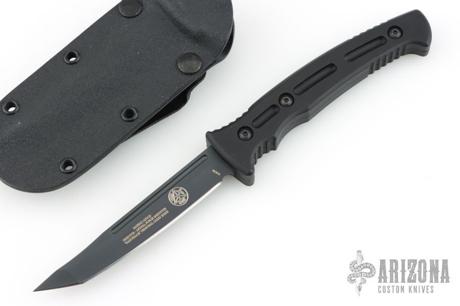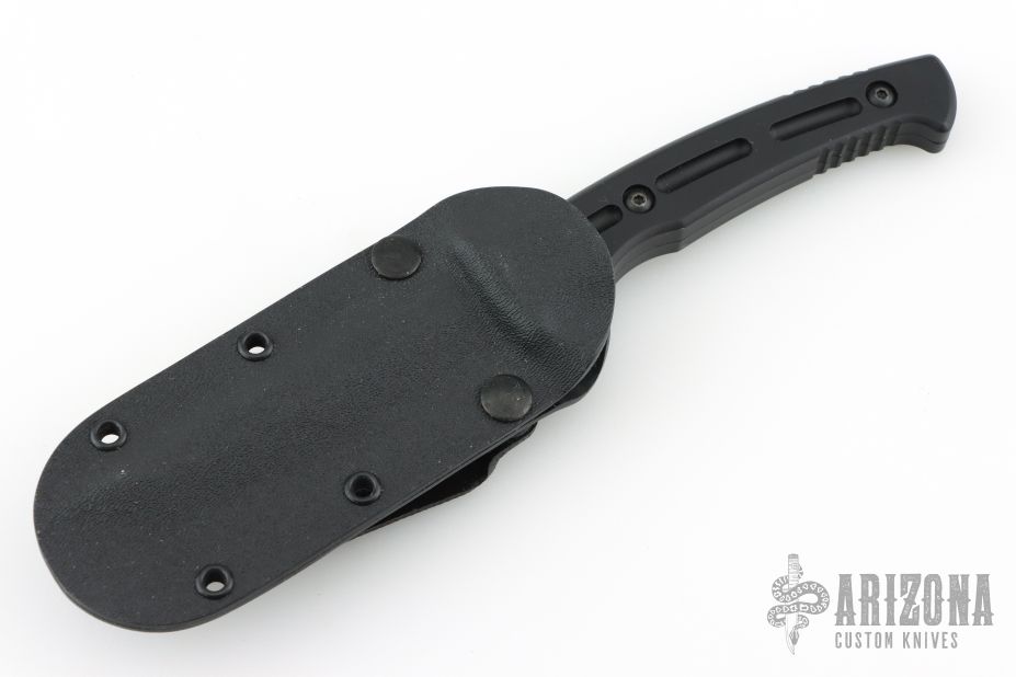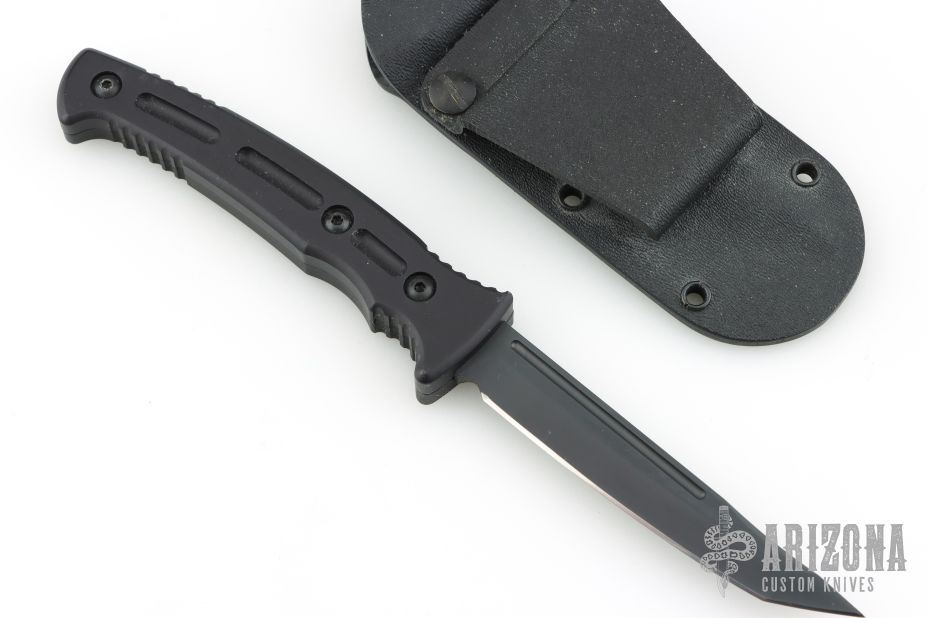 This Massad Ayoob "Razorback" by Masters of Defense has a black coated tanto blade with fullers, .176" blade stock and .637" blade depth, hidden tang construction. The handle is black coated aluminum. Comes with original black kydex sheath with belt clip. Has a couple light scuffs, otherwise excellent condition.