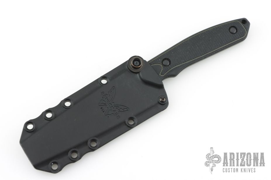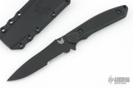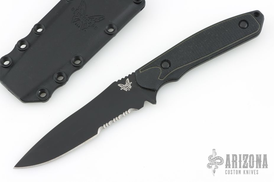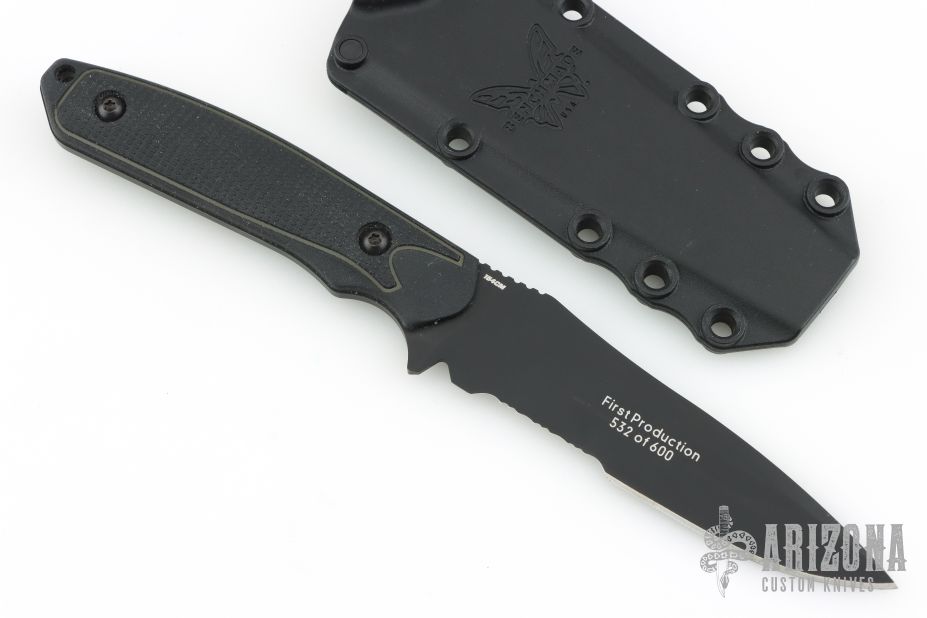 This Protagonist by Benchmade features a black partially serrated blade with false top edge and notched thumbrest, .127" blade stock and 1.164" blade depth, full tang construction. The handle has rubber scales. Comes with original sheath. Has some light scuffs, otherwise excellent condition. First production #532 of 600