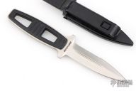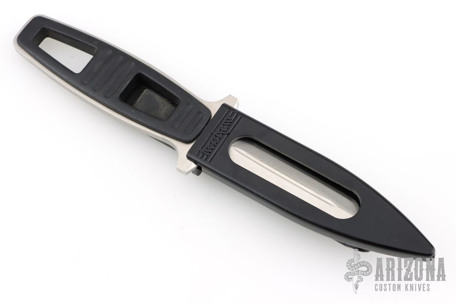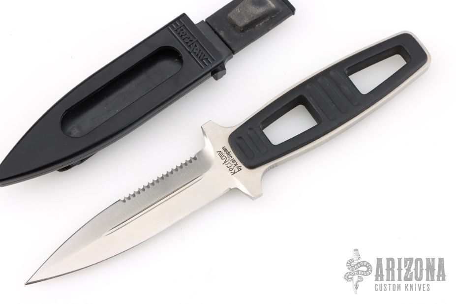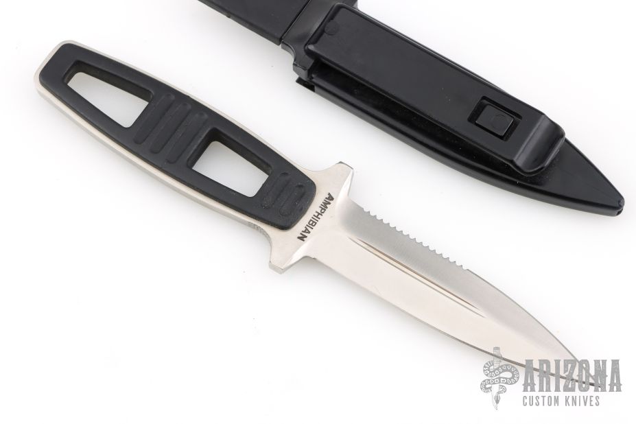 This Amphibian Dive Knife by Kershaw Knives has a satin finished double-edged dagger with fullers and partial serrations, .161" blade stock and .866" blade depth, full tang construction. The handle has black scales. Comes with original black sheath. Has some scratches, otherwise good condition.