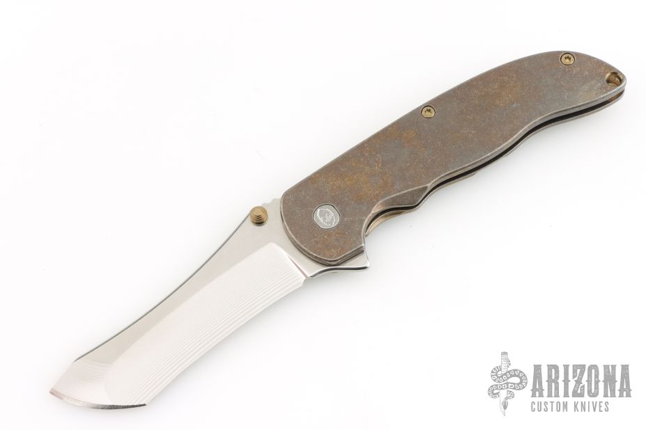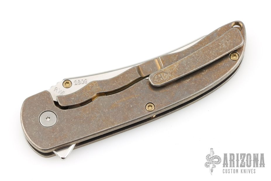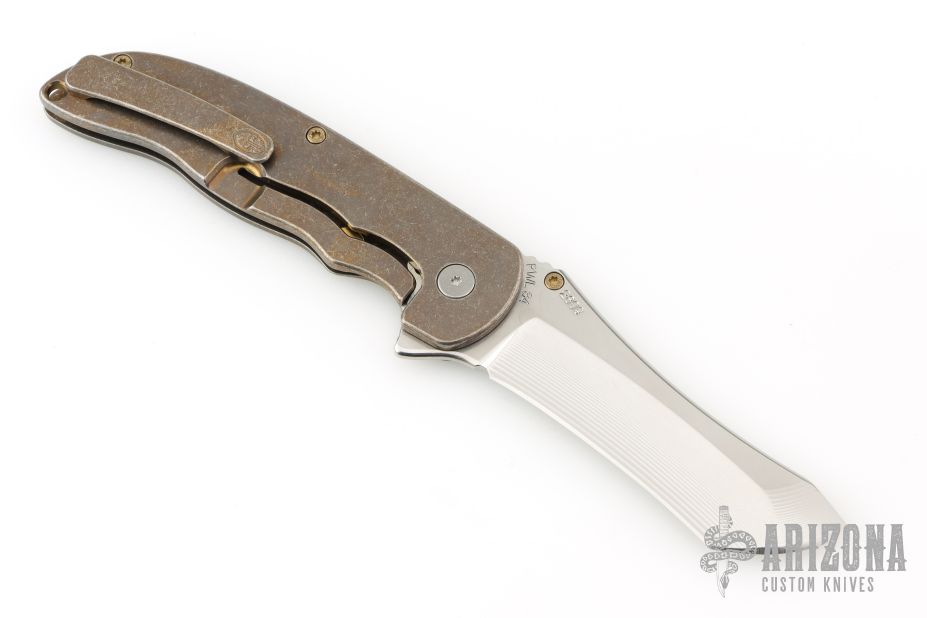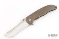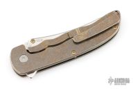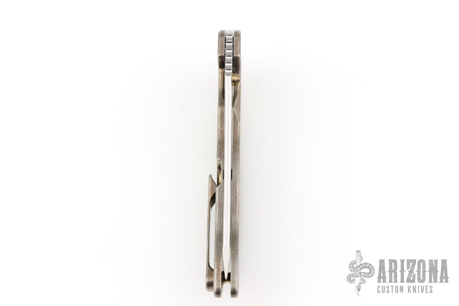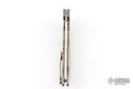 This Norseman (#2809) by John Grimsmo features a stonewashed blade with a single anodized titanium thumb stud, notched thumb ramp and flipper. Stonewash and anodized finished titanium frame with anodized titanium screws. Has a matching clip with hidden screws. Very smooth action that requires no wrist movement. Nice detent, lockup and blade seating. Rides on ceramic bearings. Comes in a Maxpedition Velcro case and card. Excellent condition.