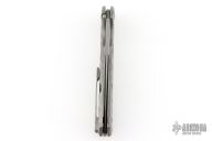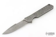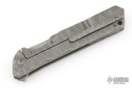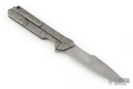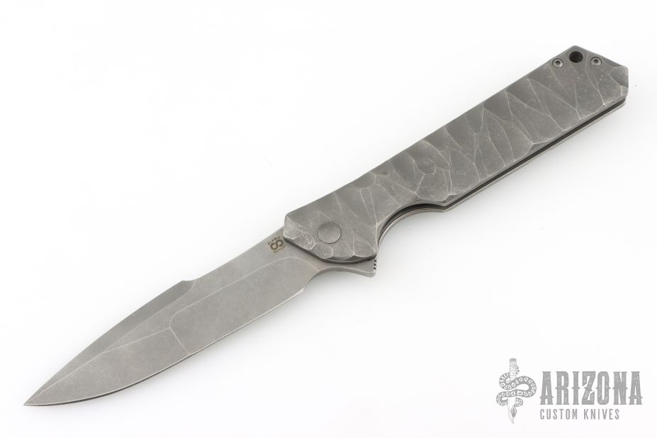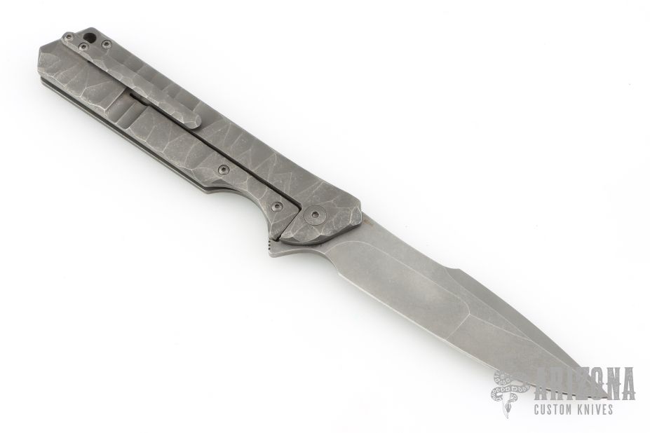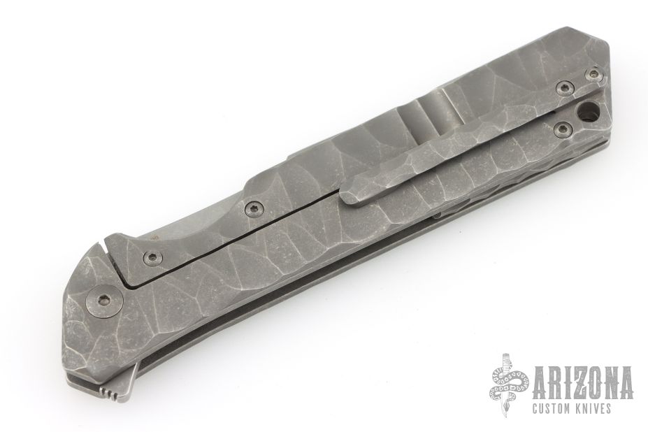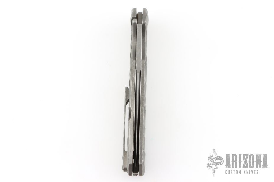 This Rainmaker by Olamic Cutlery features a tumble finished multi-ground blade with a notched flipper. The handle has a carved and contoured titanium frame with matching titanium tip up pocket clip and textured titanium backspacer. Nice detent and lock up. Comes with original zipper case, and COA dated 8-20-2019 #RFL138-H. Has a couple light scuffs, otherwise Excellent condition.