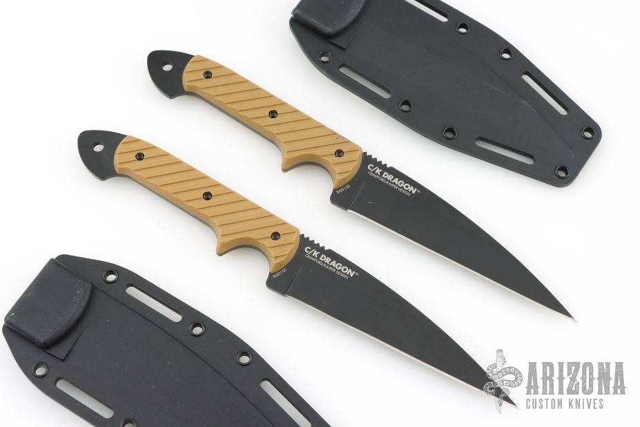 These C/K Dragons by CRKT is a Crawford and Kasper design, it has a black finished blade with notched thumbrest, .134" blade stock and 1.193" blade depth, full tang construction. Comes with original sheath, box and papers. Excellent condition.