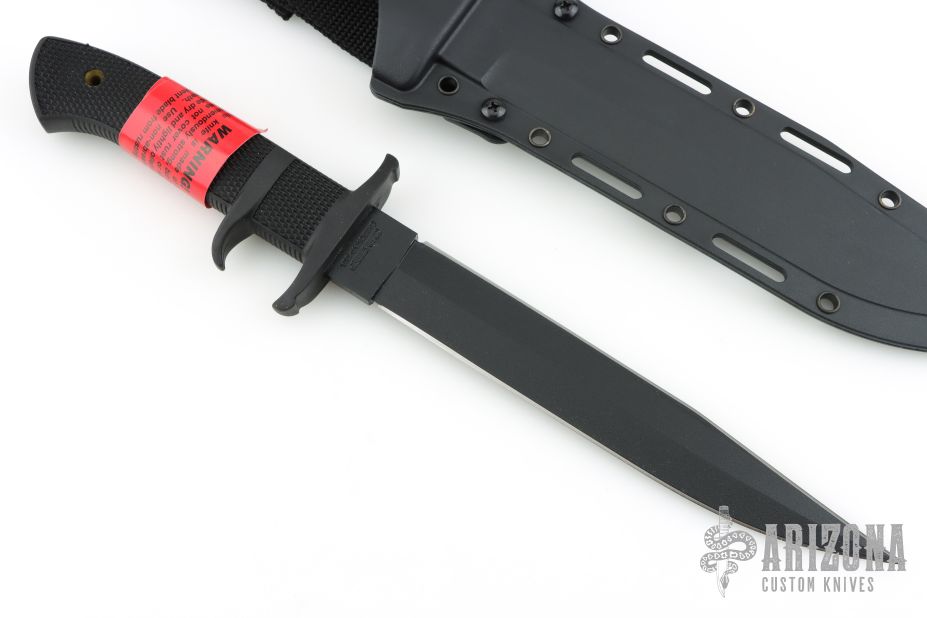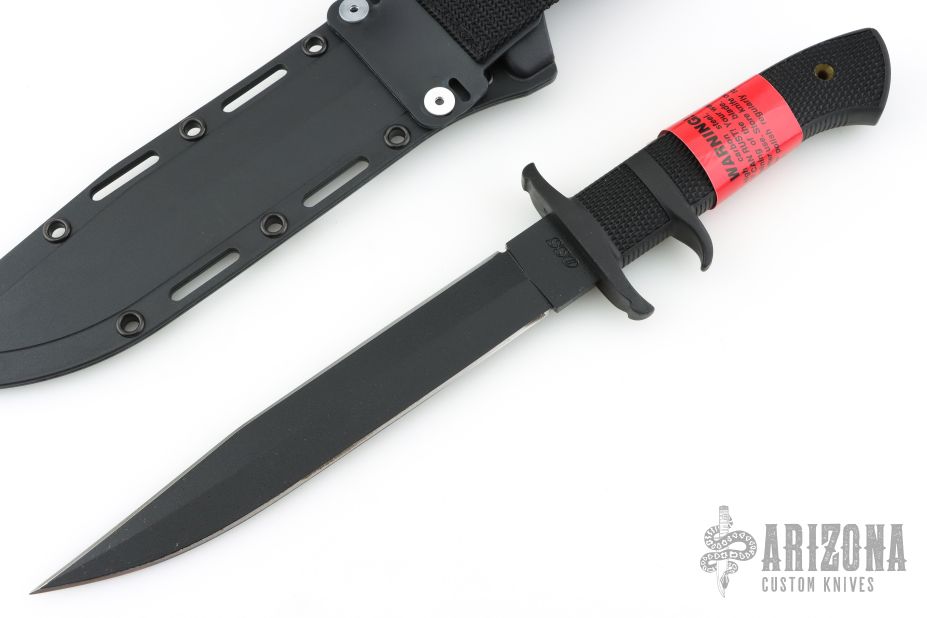 This OSS by Cold Steel features a black double edged blade, .194" blade stock and 1.188" blade depth, hidden tang construction with a rubber handle. Comes with a molded plastic sheath and original box. Excellent condition. Still has the red warning label on the handle.