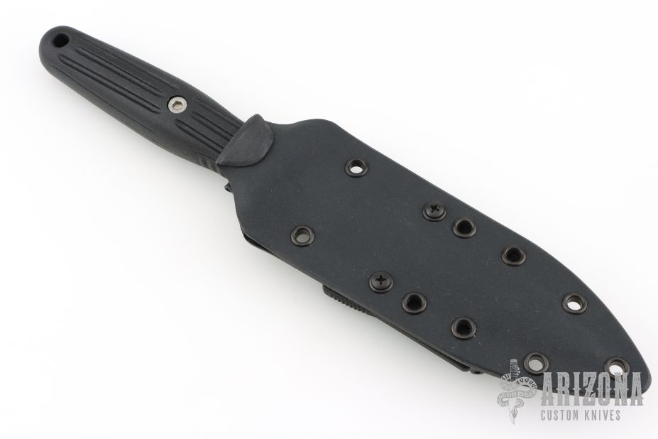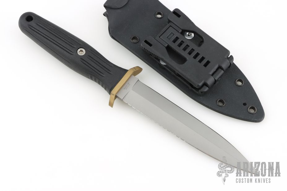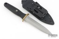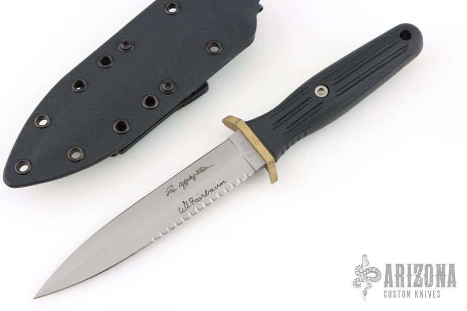 This Applegate-Fairbairn Combat Dagger (#8732) has a bead blasted 440C stainless steel DE spear point blade with serrations, and hidden tang. Blade stock is 3/16", depth is 1-1/16". Handle is non-slip black polymer with contoured grooves, bead blasted brass guard, and lanyard hole. Comes with original box, papers and kydex sheath. Excellent condition.