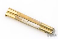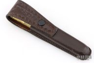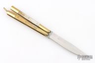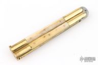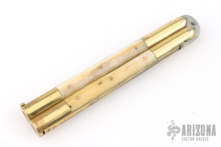 This balisong from the Philippines features a clip point blade with a satin finish and false top edge. The handle has brass bolsters, front and rear, brass channel construction, and bone scales with copper pins, brass T-latch. Comes with black nylon belt sheath and original box. Has some scratches and patina, otherwise great condition for its age.
