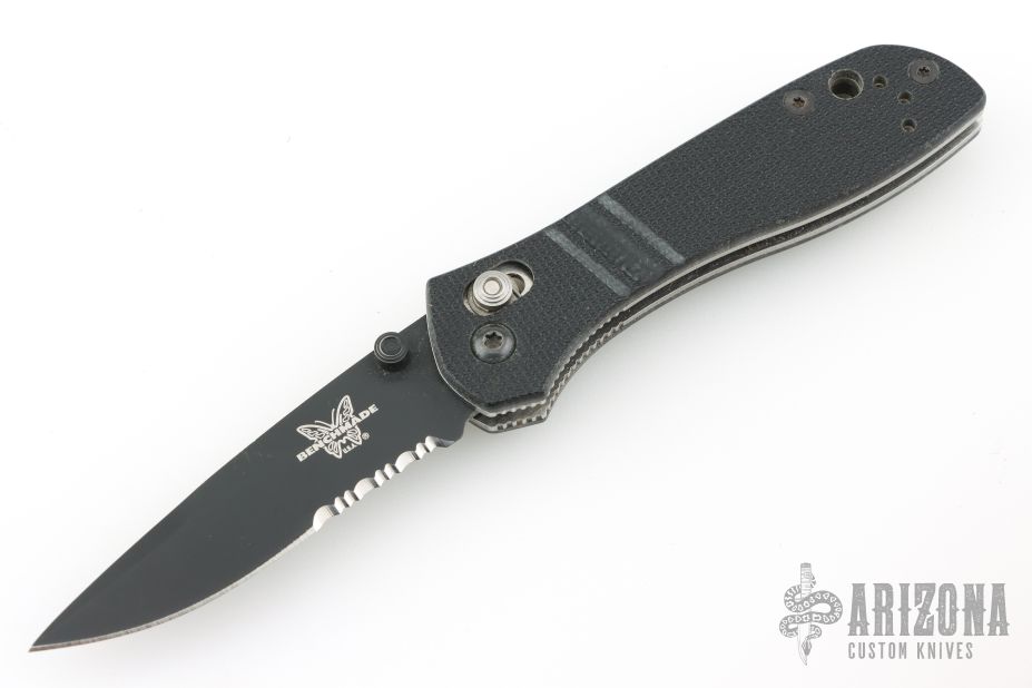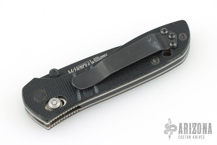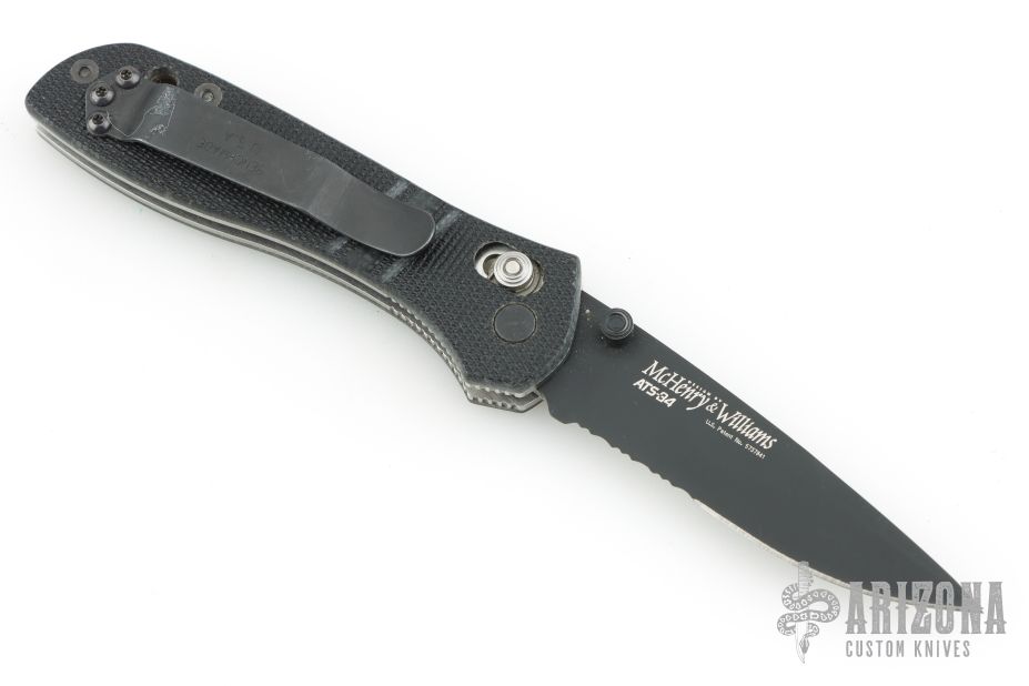 This 705 McHenry and Williams design by Benchmade features a B12 Coated blade finished spear point blade with dual thumbstuds and partial serrations. The handle has black G-10 scales with stainless steel liners and a tip up reversible black stainless steel clip. Comes with original box and papers. Has some light scuffs and scratches, great overall condition.