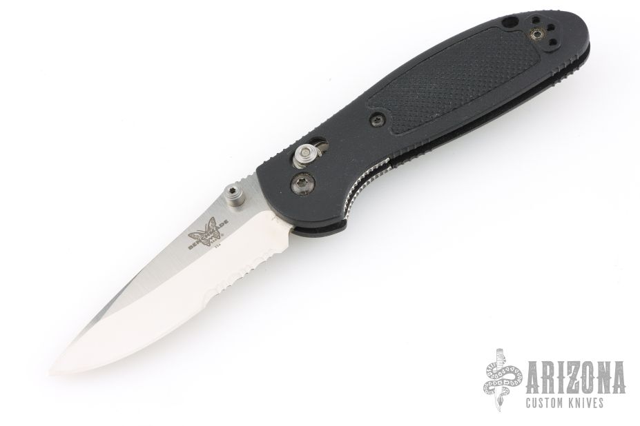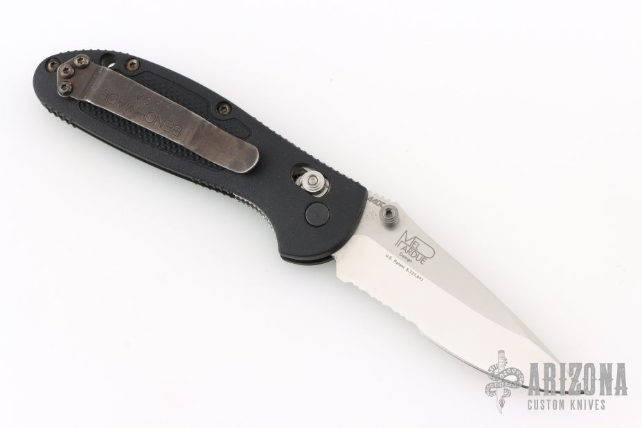 This 556S Mini Griptilian by Benchmade features a stonewashed drop point partially serrated blade with dual thumb studs and notched thumbrest. The handle has flack FRN scales, stainless steel sub frame and black backspacer. The black stainless steel tip up clip is reversible for right or left hand carry. Comes with original box and papers. Has a couple light scuffs otherwise Excellent condition.