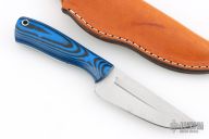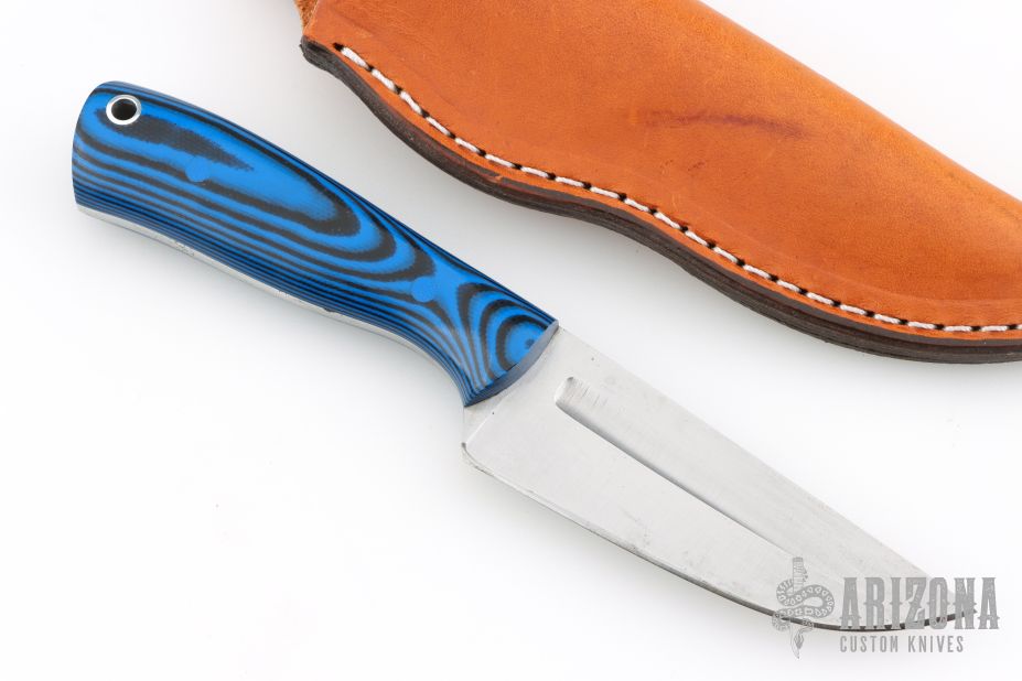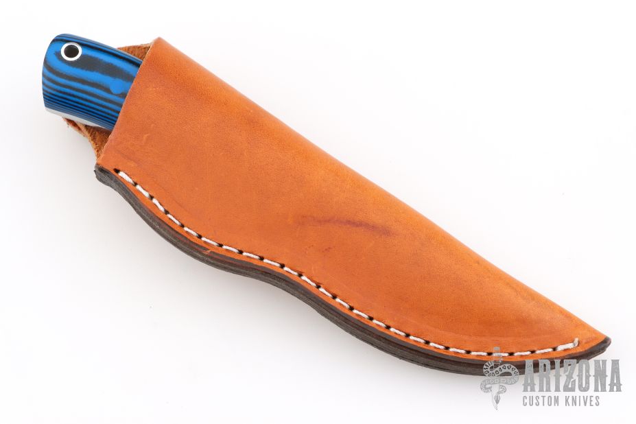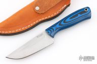 This Beartooth EDC by 7Forge features a satin finished blade with fullers, .126" blade stock and 1.182" blade depth, full tang construction. The handle has black/blue G-10 scales with blue G-10 pins and a lanyard hole. Comes with original box and brown leather sheath. Has a couple light scratches, otherwise excellent condition.