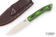 This Bird and Trout by Bark River Knives features a satin finished blade with .095" blade stock and .854" blade depth, full tang construction. The handle has toxic and black SureTouch scales with black pins and a lanyard hole. Comes with original box and brown leather sheath. Excellent condition.