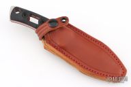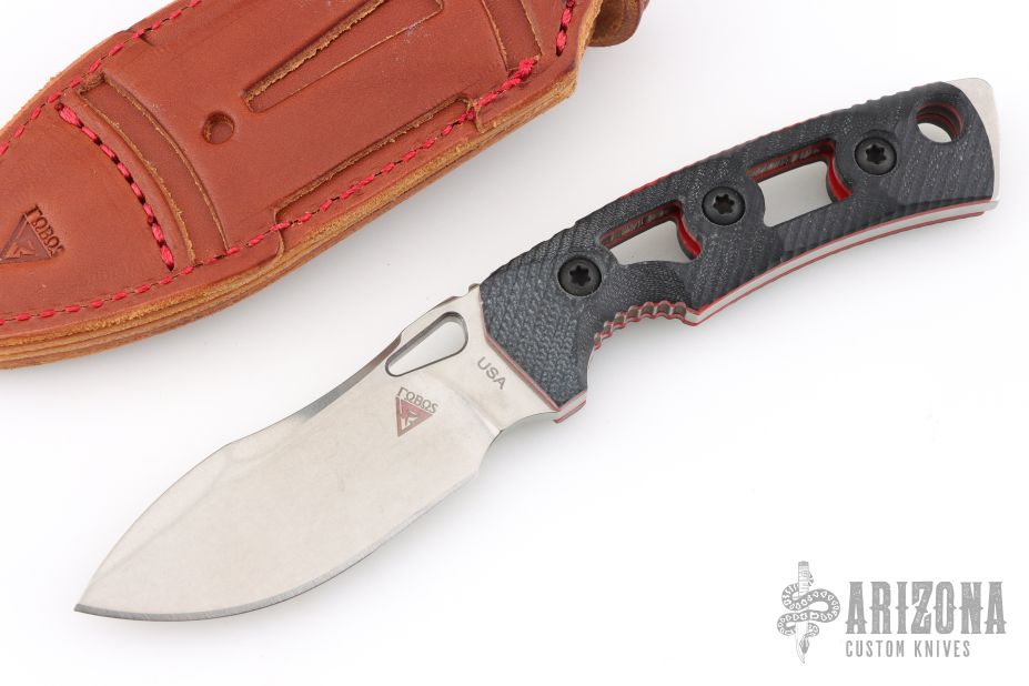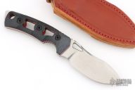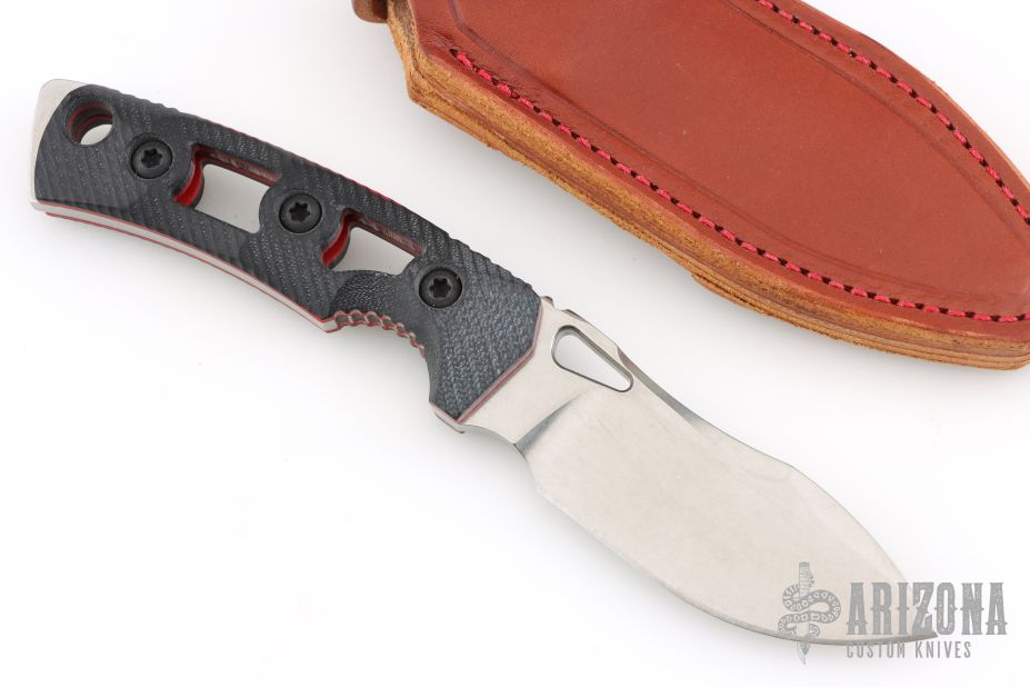 The Tier 1 Mini-Mini EDC your perfect everyday carry companion! Designed for those who prefer a more compact option, this downsized version features a 3.5" blade for effortless portability while maintaining a full-sized handle for optimal grip and control. Each knife comes complete with an ambidextrous leather sheath, offering versatile vertical or horizontal carry options. Has a stonewashed blade with notched thumbrest, .188" blade stock and 1.241" blade depth, full tang construction. Has black G-10 scales with red liners. Comes with original box, papers and brown leather sheath. Excellent condition.