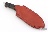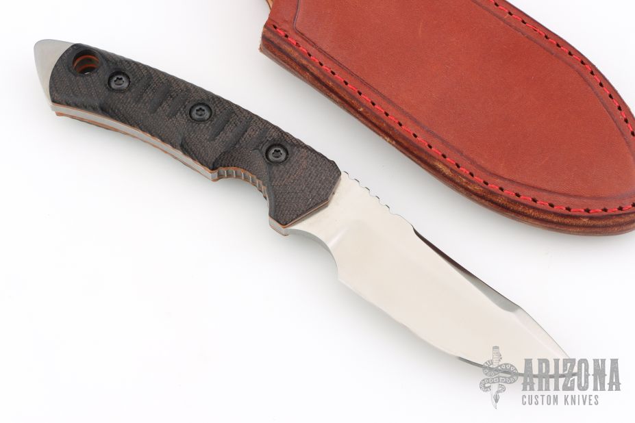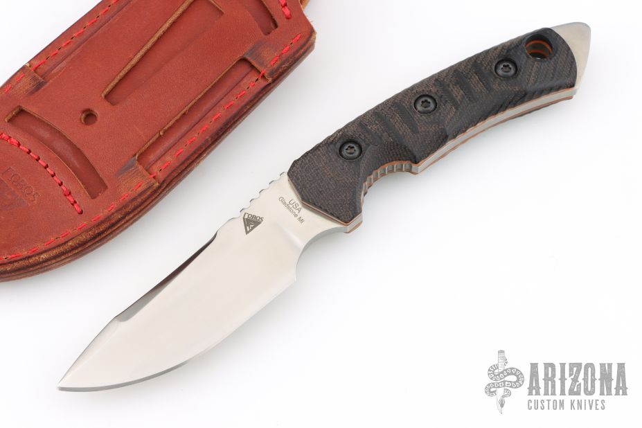 This Fobos Tier1 Mini features a satin finished drop point blade with false top edge, .190" blade stock, 1.219" blade depth, notched thumbrest, and full tang construction. The handle features double black canvas micarta scales, orange liners, notched finger choil and lanyard hole in pommel. Comes with original box, papers, and leather sheath. Excellent condition.