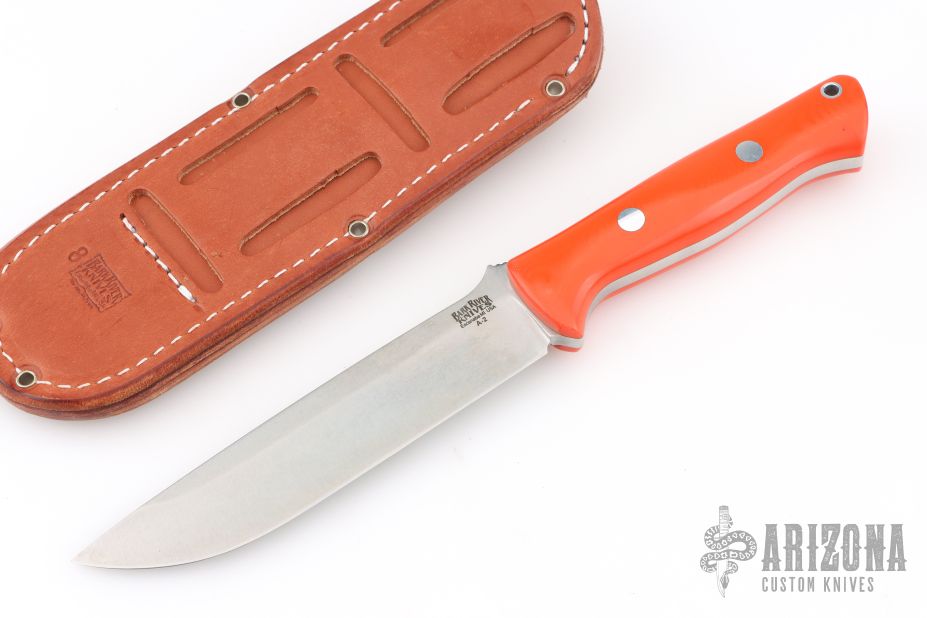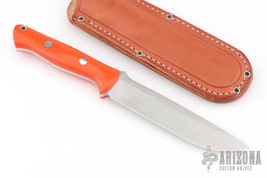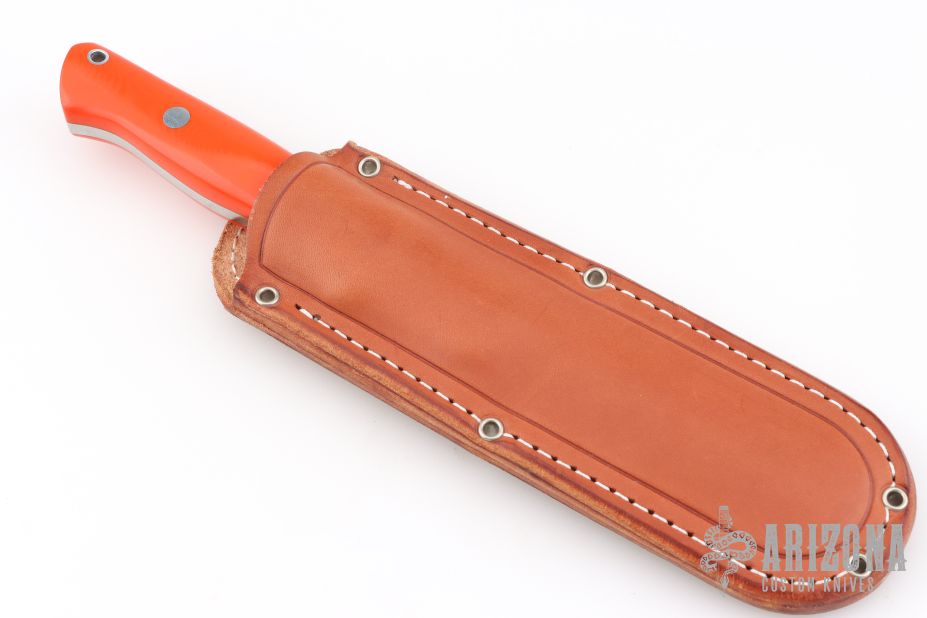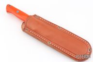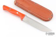 This Bravo 1.5 from Bark River features a satin finished blade and orange G-10 scales. Full tang construction with .217" blade thickness and 1.173" blade depth. Notched thumbrest. Includes brown leather sheath with belt loop and original box. Excellent condition.
