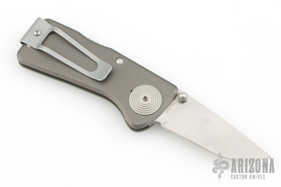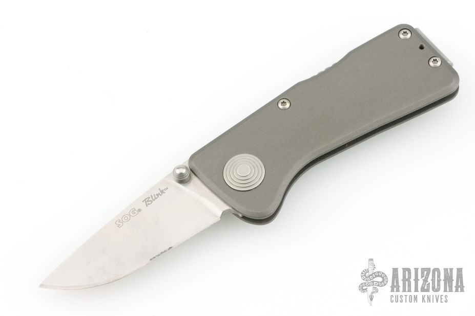 This Blink from SOG Knives features a satin drop point blade with dual thumbstuds. The Handle is comprised of matte aluminum over stainless steel lockbar with reversible tip up clip. This knife is Pre-Patent, it is marked "Pat. Pend." Comes with original box and papers. Has some marks on the blade and body, great overall condition.