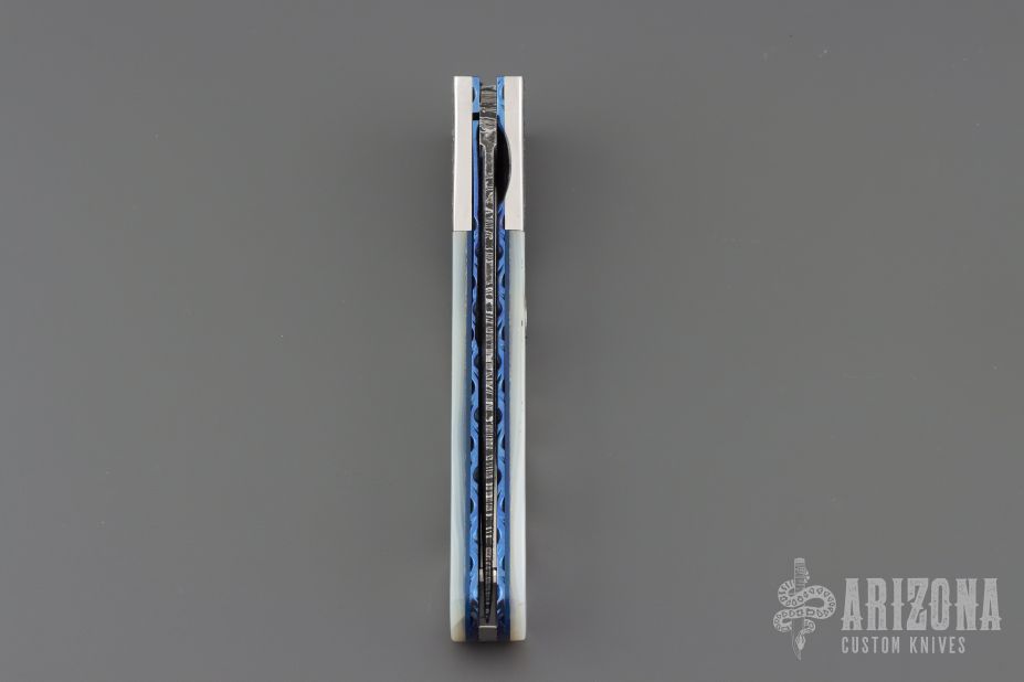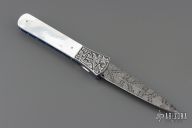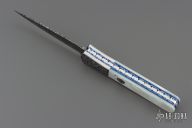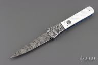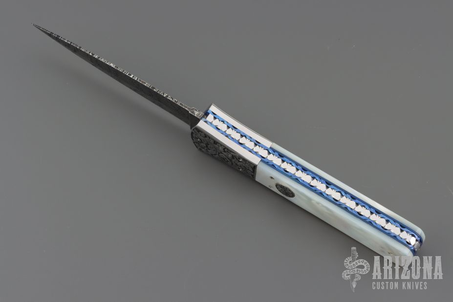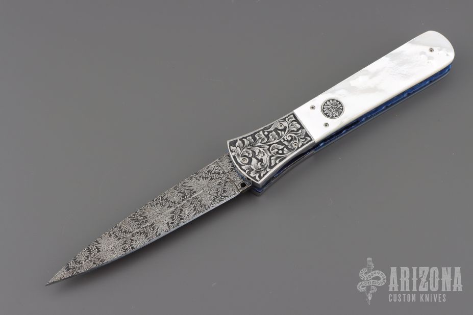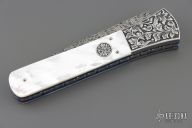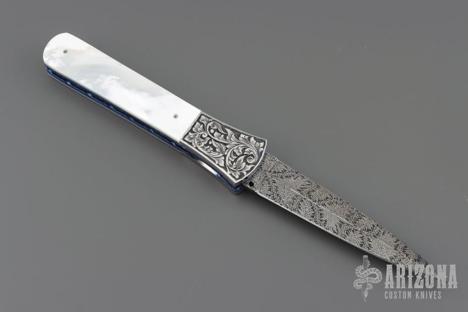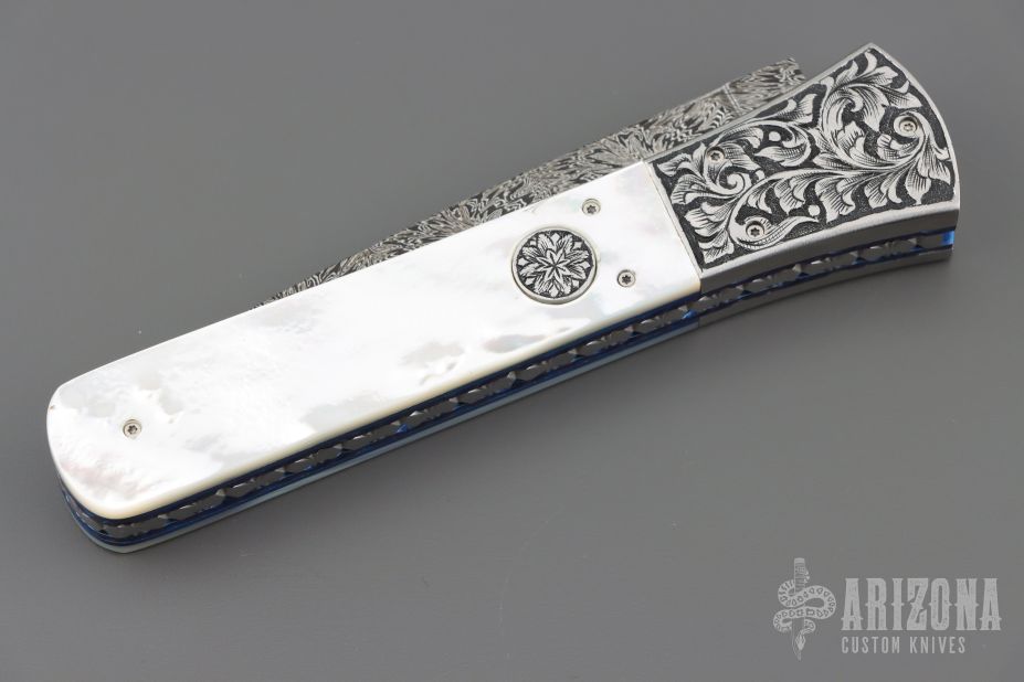 This Linerlock Auto by Afaaq Custom Knives features a Mosaic Damascus blade with false top edge. The handle has engraved stainless steel bolsters, fileworked and anodized titanium liners, mother of pearl scales with black liners, fileworked stainless steel backspacer, engraved stainless steel button. Nice action, lockup and blade seating. Comes with a leather case and COA dated 10-30-25. New from maker!