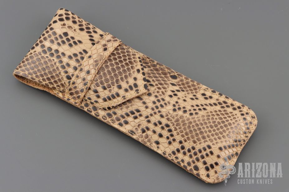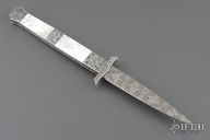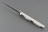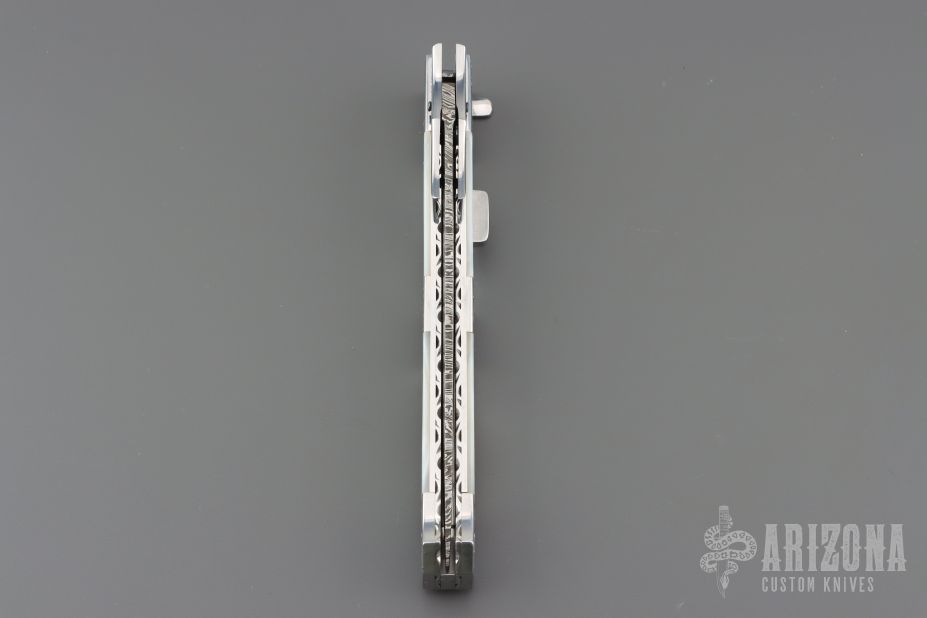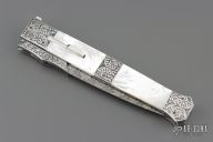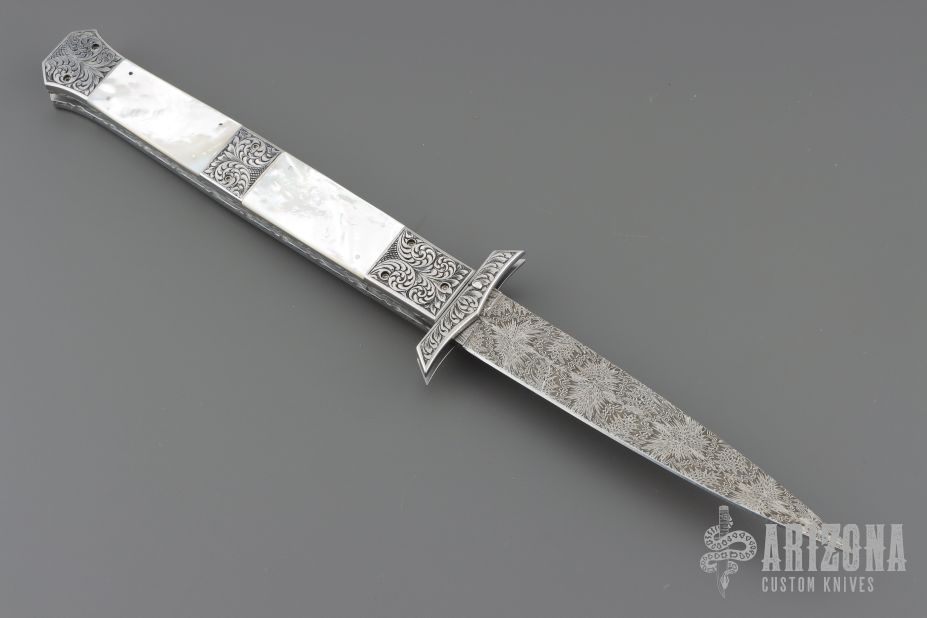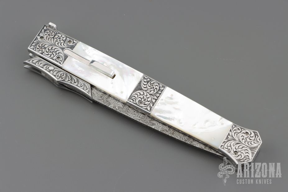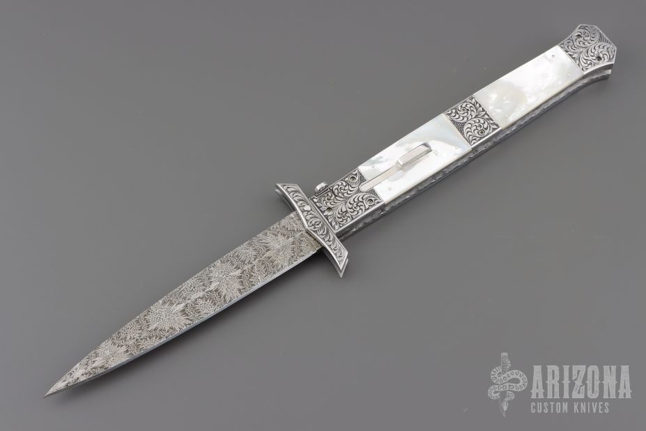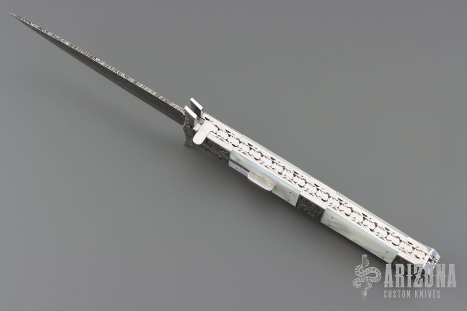 This Swing Guard Auto by Afaaq Custom Knives features a Mosaic Damascus blade with a false top edge. The handle has engraved stainless steel bolsters, fileworked stainless steel liners, mother of pearl scales, fileworked stainless steel backspacer. Comes with a leather case and a COA dated 12-22-25. New from maker!