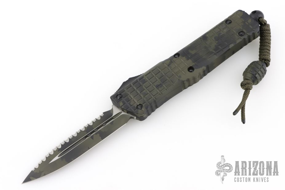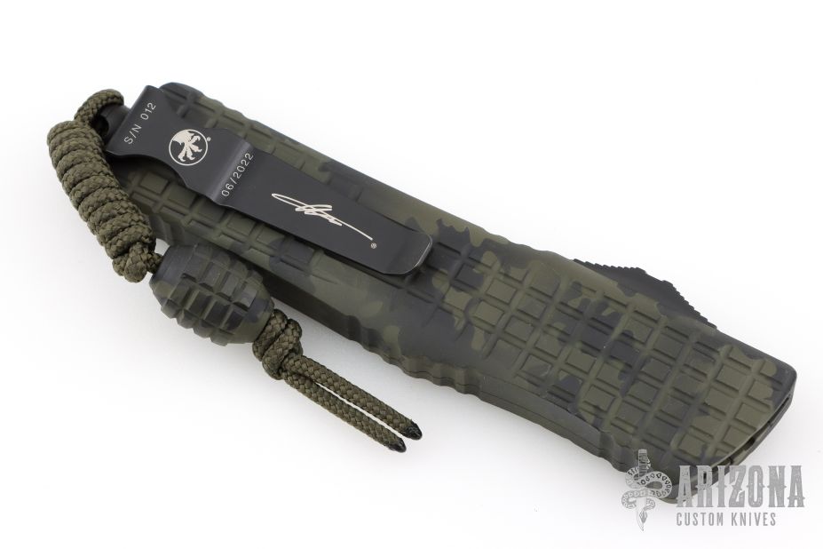 This Combat Troodon OTF automatic features a camo coated D/E blade with one fully serrated edge. The handle is composed of a camo aluminum frag pattern frame. Stainless steel clip. Glass breaker. Signature Series, 06/2022, S/N 012. Has a couple light scuffs, otherwise Excellent condition. Comes with original box and papers.