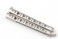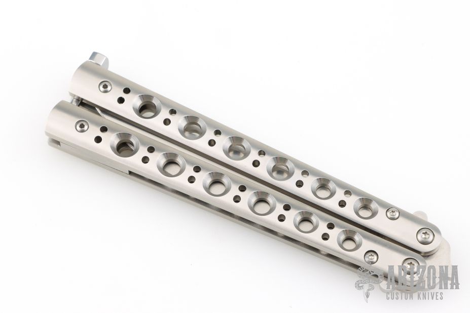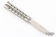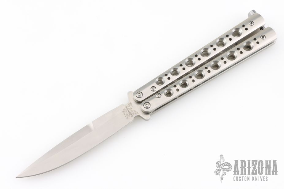 This Model 62 Balisong by Benchmade features a stonewashed spear point D2 blade with a false top edge. The handle has stainless steel handles and latch. Includes the original box, papers and nylon sheath. Excellent condition.