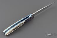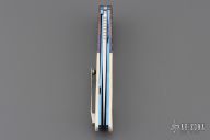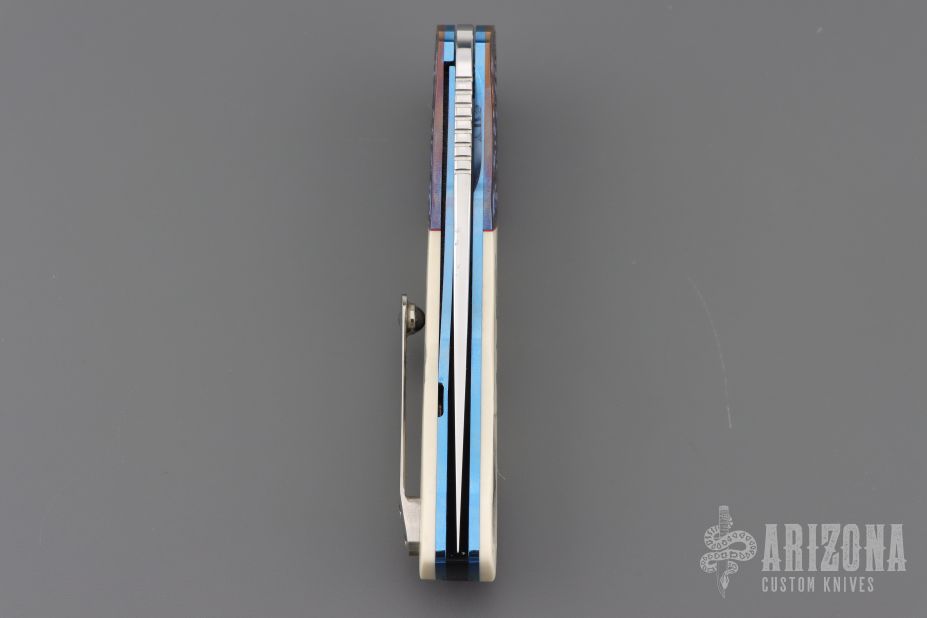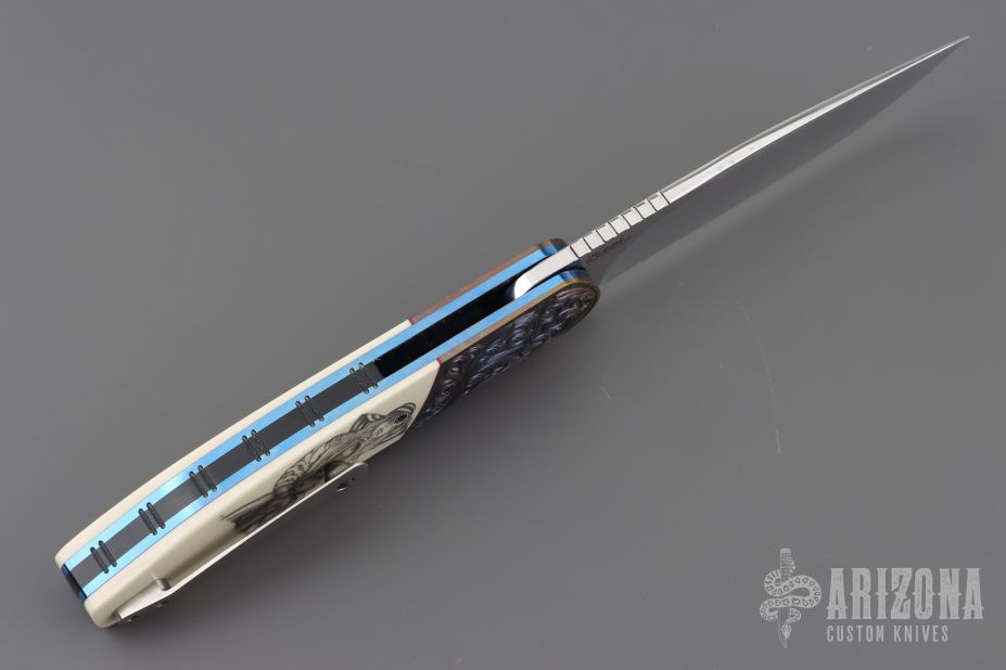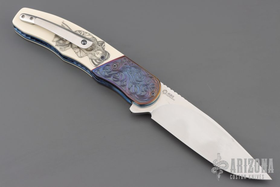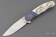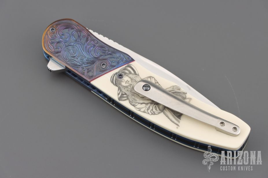 This HI-03 by Helgard & Ida Mostert features a hand rub satin finished L4528 Steel blade with a notched thumbrest and flipper. The handle has engraved zirconium bolsters, juma synthetic ivory scales, anodized titanium liners with notched spines, black G-10 backspacer, tip up titanium clip with ceramic ball. The bolsters were engraved and the scrimshaw was done by Ida. Rides on ceramic IKBS bearings, nice detent, lockup and blade seating. Comes with a leather case and a COA dated Oct 2024. Excellent condition.