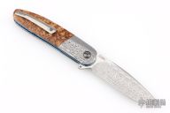 This HI-AT by Helgard & Ida Mostert features a Ladder Pattern Damasteel blade with a notched thumbrest and flipper. The handle has matching Damasteel bolsters, black ash burl scales, anodized titanium liners with notched spines, black G-10 backspacer, tip up titanium clip with ceramic ball. Rides on ceramic IKBS bearings, nice detent, lockup and blade seating. Comes with a leather case and a COA dated May 2024. Excellent condition.