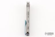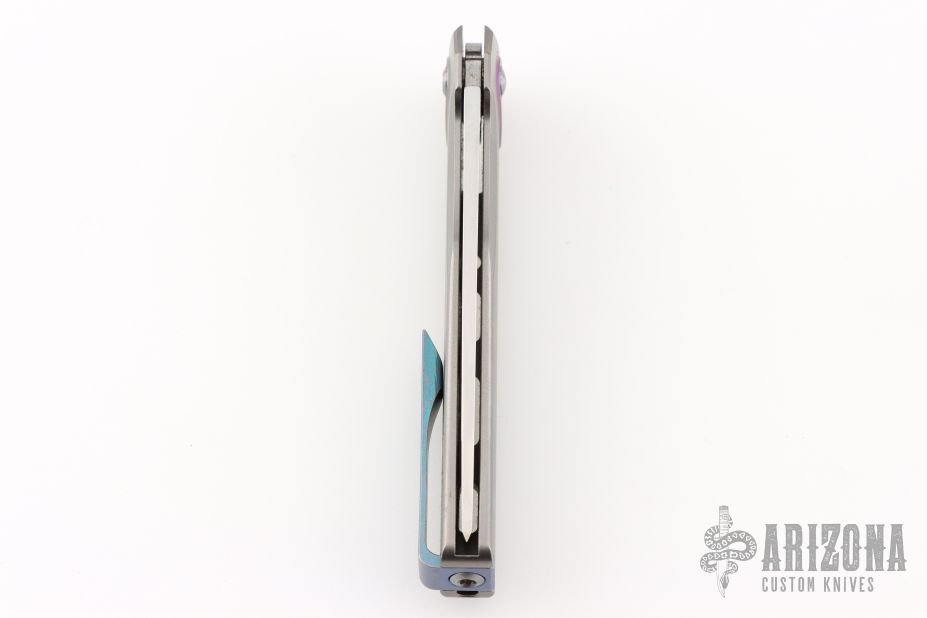 This Sonora by Machine Wise features a lightwash finished blade with flipper tab. The handle has a fine step milled titanium integral frame with an anodized titanium inlaid bolster. Button lock open and closure, with L/R reversible tip up anodized titanium clip. Includes original 3D printed box, tool, lube and card. S/N 1072. Excellent condition.