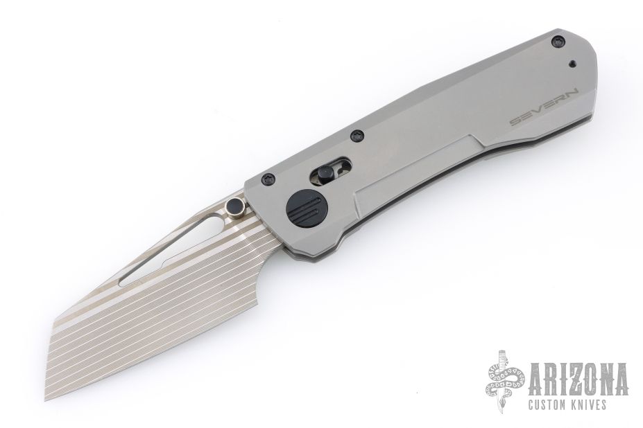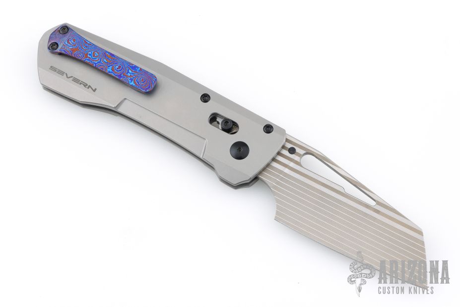 This SEVERN variant features green anodized titanium scales with a bead blast and subtle stonewashed finish… Blade steel is M390 (HRC 60-62) and features our unique “laser bacon” pattern… The pocket clip is one piece milled titanium and features a matching “laser bacon” pattern… Hardware is steel, with T8 screws throughout!