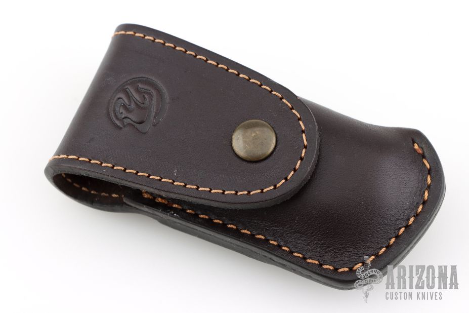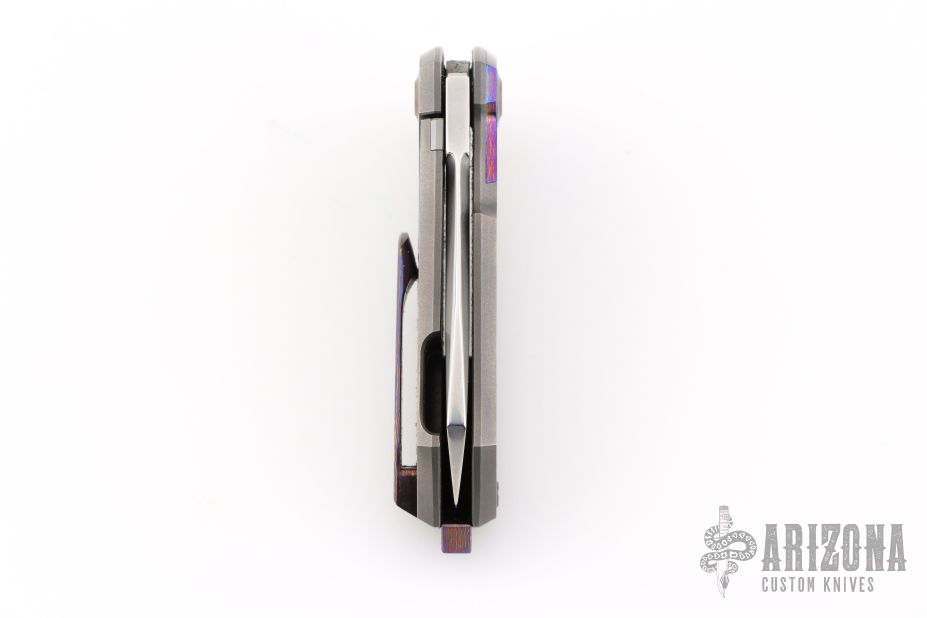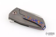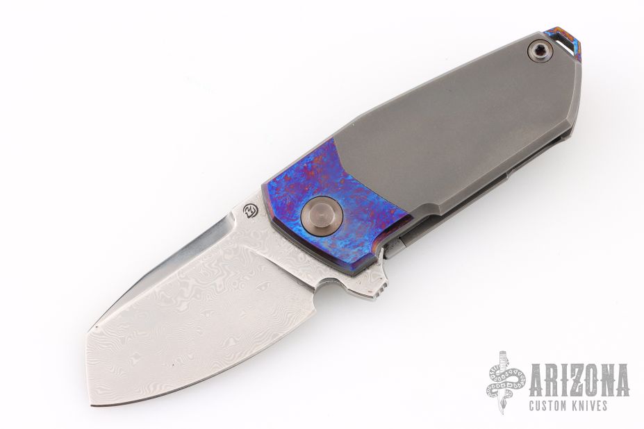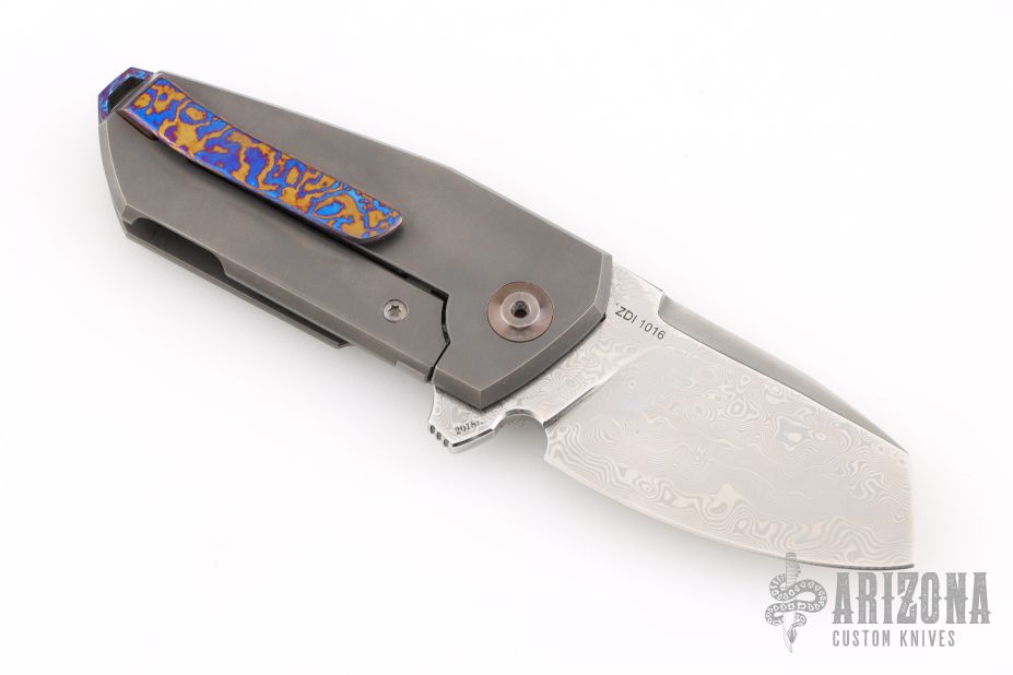 This Bulldog flipper by Alexander Churburkov features a Zladinox ZDI-1016 Damascus Steel blade with notched flipper. The handle has an anodized titanium frame with inlaid timascus bolsters, backspacer with lanyard hole and tip up clip with hidden screws. Has stainless lockface insert, rides on bearings, nice detent, lockup and blade seating. Excellent condition. Comes with a leather belt sheath.
