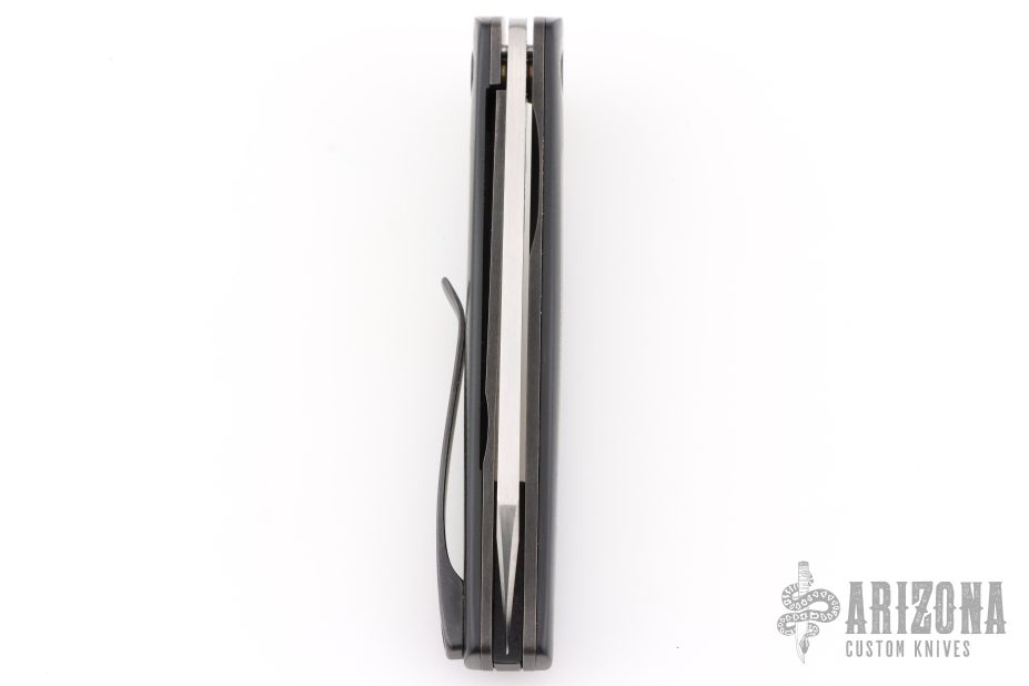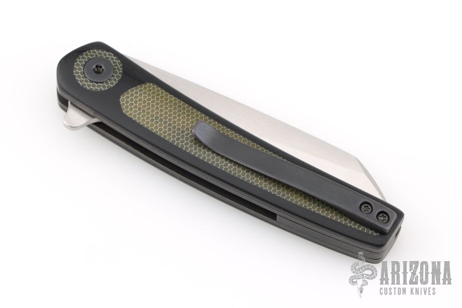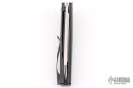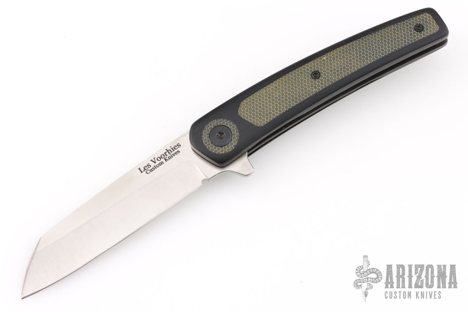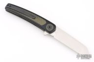 This Black Mamba flipper by Les Voorhies features a satin finished blade with flipper. The handle has black G-10 scales with green C-Tek inlays and pivot collars, blackwashed titanium liners, backspacer and tip up clip. Comes with original box dated 12/23/25. Rides on bearings. Nice detent, lockup and blade seating. Excellent condition.