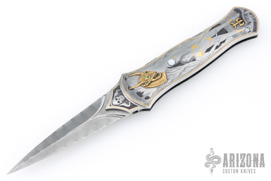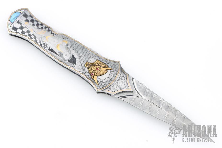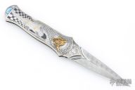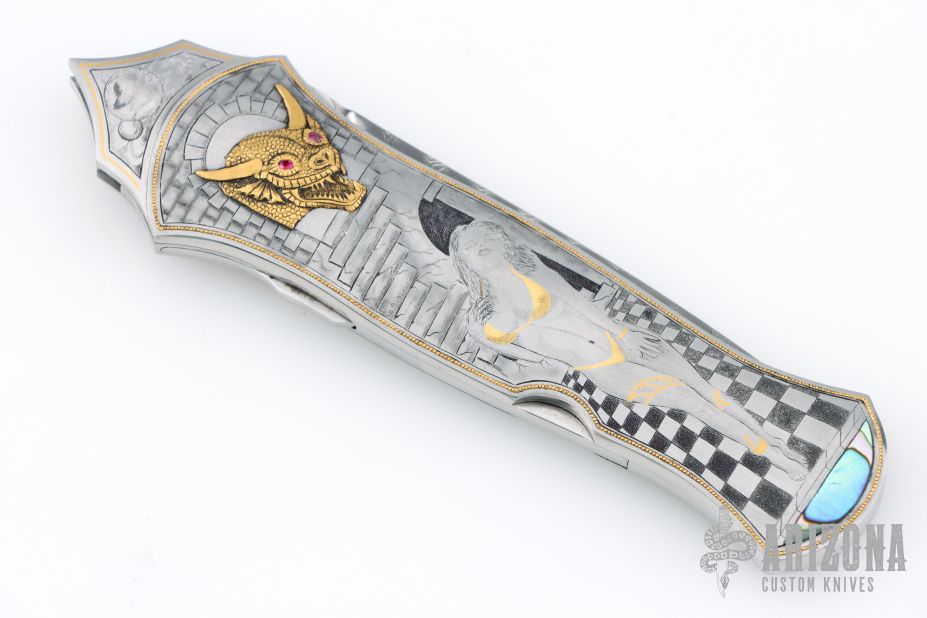 This Interframe Lockback Auto by Ron Best features a Damasteel dagger blade with false top edge and fullers infront of the ricasso. The handle has a stainless steel frame with beautiful engraving of a scantally clad female warrior and two gold dragon overlays with emerald and ruby inlaid eyes, a mother of pearl inlay. The frame is trimmed in gold inlays. Fantastic engraving by "JD" which i think is Jere Davidson. The handle also has a stainless steel spacer and release button. Nice lockup, action and blade seating. Excellent condition. Comes with original hard case.