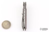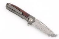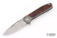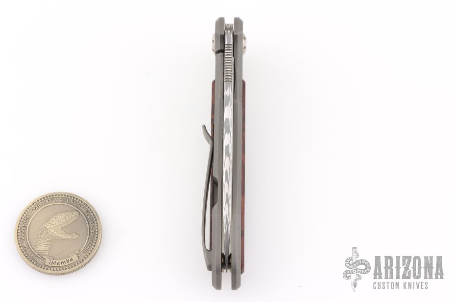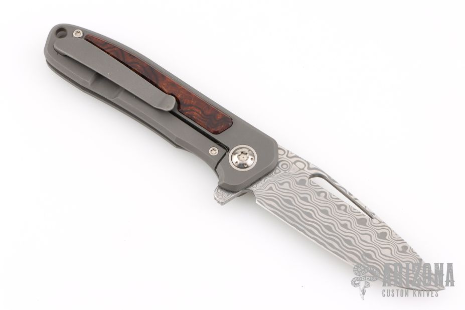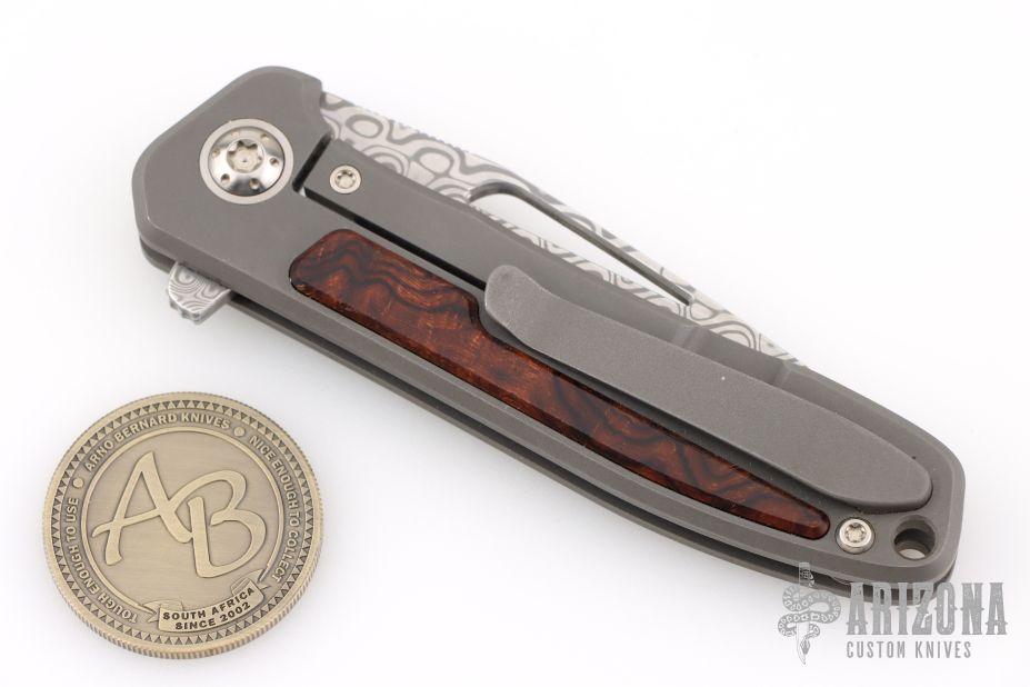 Arno Bernard's iMamba Frame Lock Flipper is a EDC designed for high performance and hard use. The blade is hard ground Damasteel with a thumbhole, notched thumbrest and flipper. Ball bearing pivot. The handle is bead blasted titanium with Desert Ironwood inlays, bead blast finished titanium tip up clip with hidden screws. Comes with original box, slip sheath, COA and tools. Has a couple light scuffs, excellent condition otherwise.