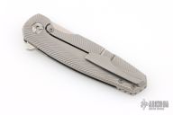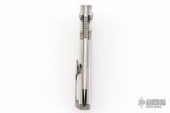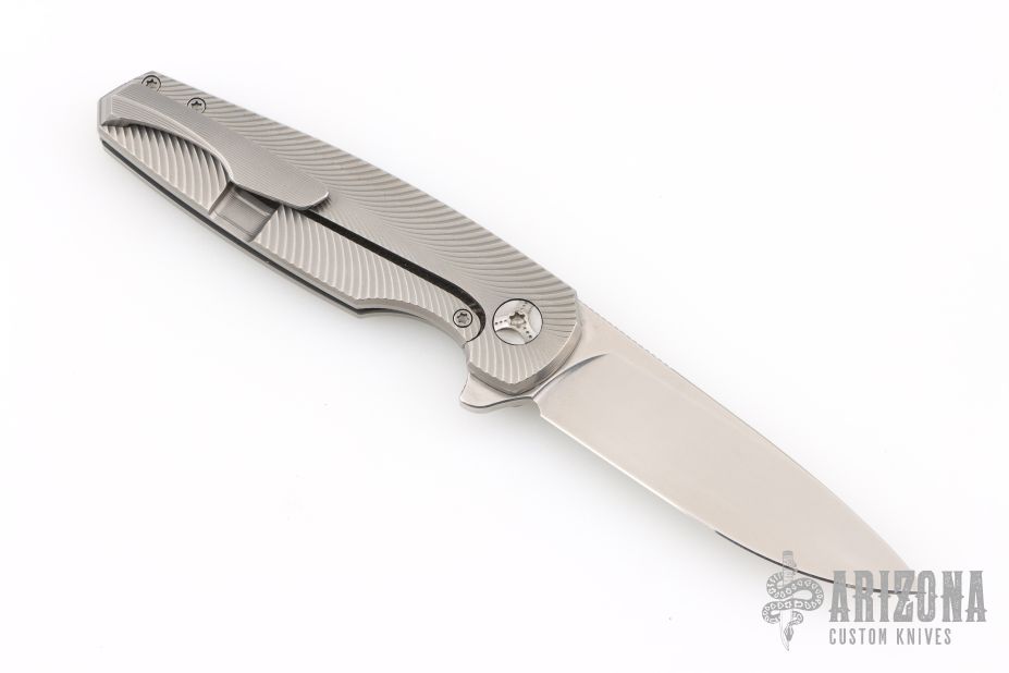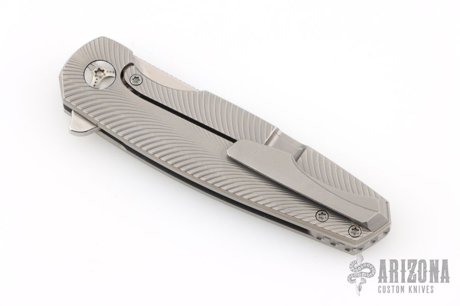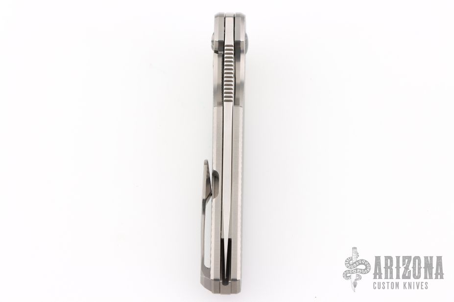This Morpheus by Holt Bladeworks features a stonewashed 2.0 blade with a notched thumbrest and flipper tab. The handle features a Feather milled titanium frame in the nude with matching tip up pocket clip and hardware. Custom pivot with Meteorite inlay. Nice detent, lock up and blade seating. Includes the original zipper case and Selinko card. Comes with original pivot and tool. Has a couple light scuffs, otherwise excellent condition.