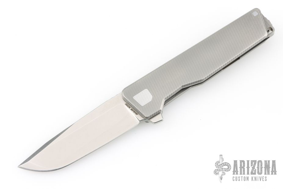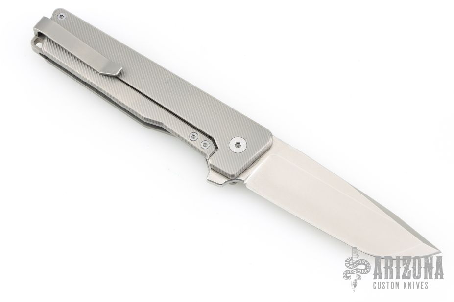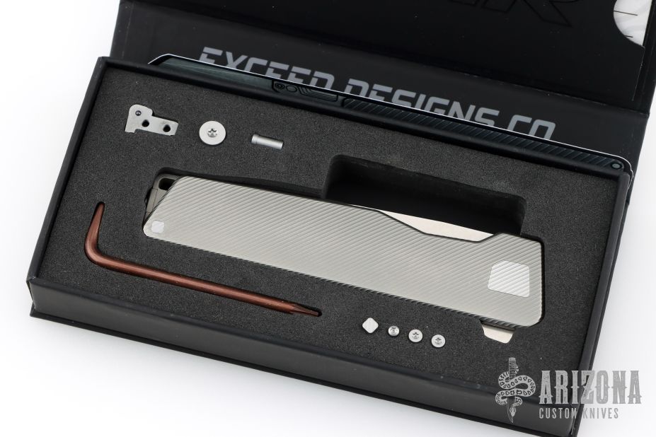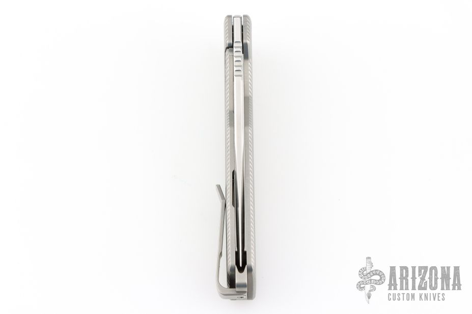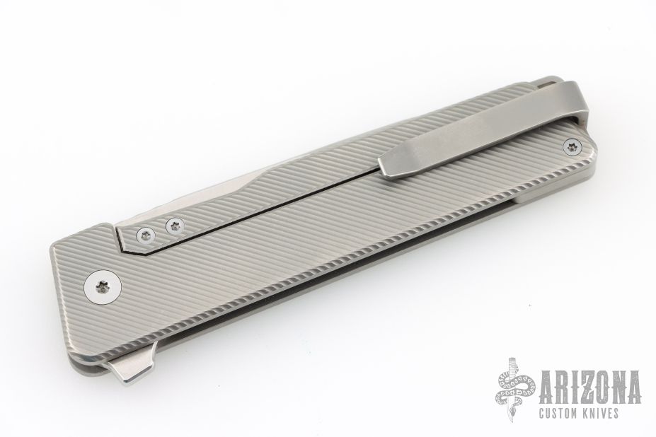 - CNC’D 6AL-4V Titanium Deep-Carry Clip — reversible for LH or RH carry attached to a custom rear spacer that meets perfectly with the blade when closed.