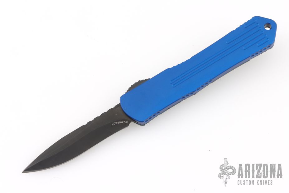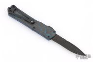 This Manticore-S by Heretic Knives has a DLC recurve blade and a blue camo carbon and blue aluminum handle. Out-the-Front knife with a clean and functional aesthetic. It features a contoured aluminum chassis with jimping all along the sides. This lightweight and capable OTF knife opens and closes smoothly, making for an excellent everyday or tactical carry. Comes with a ball-bearing glass breaker and a deep carry pocket clip. Comes with original box and papers. #169. Excellent condition.