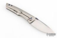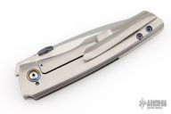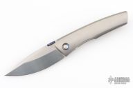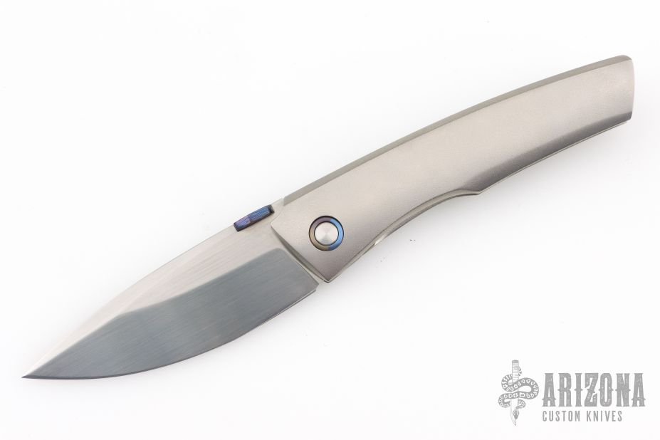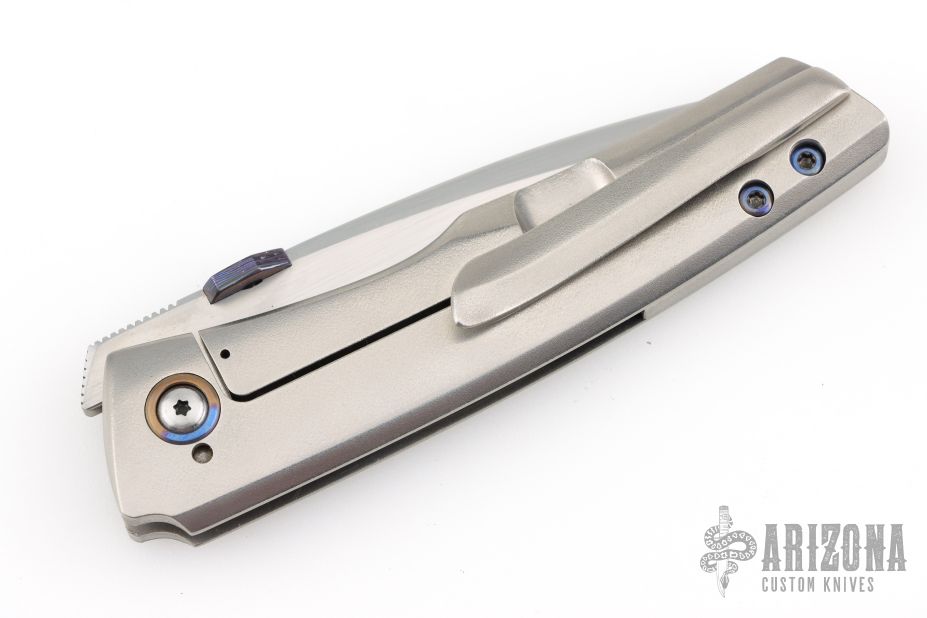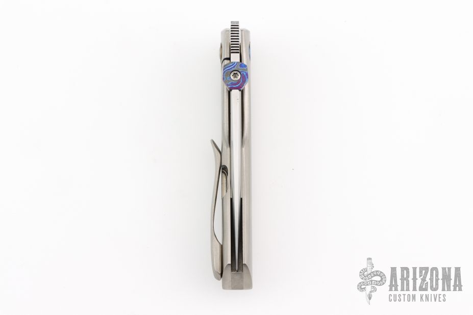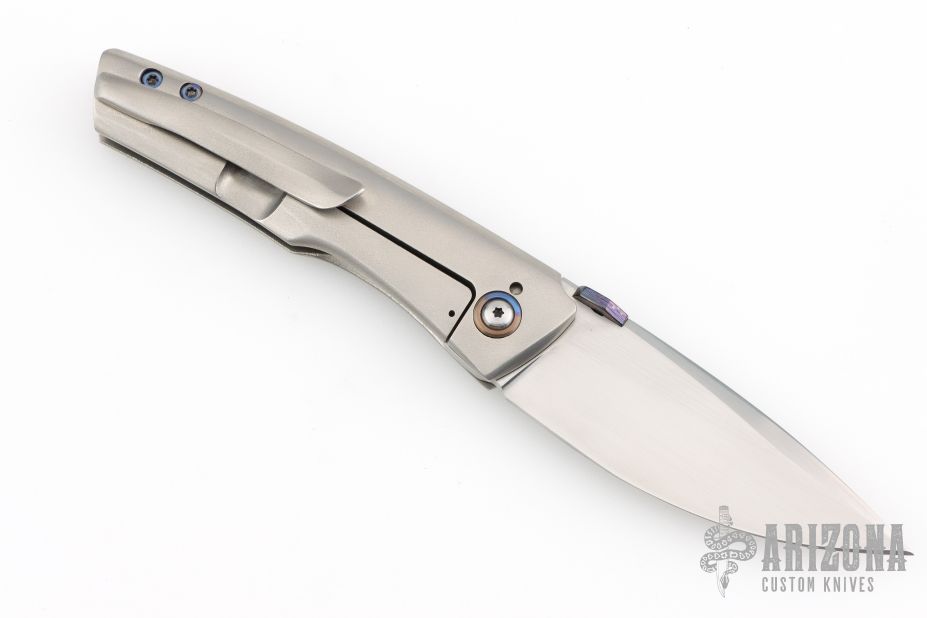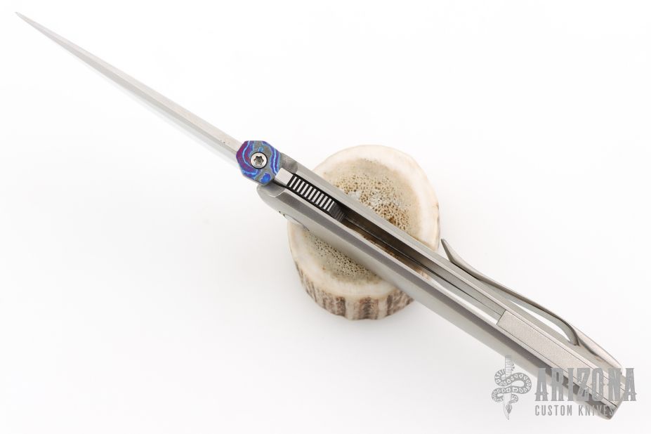 This Psyop Form by Tuff Knives features a hand rub satin finished blade with a black timascus thumbdisc. The handle has an orange peel finished titanium frame, backspacer and tip up pocket clip with hidden screws, anodized titanium pivot collars. Nice blade seating, lockup and nice detent. Rides on bearings. Includes a zippered case and COA dated 2025. Has a couple extremely light scratches, otherwise excellent condition. #2 of 2