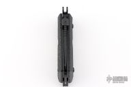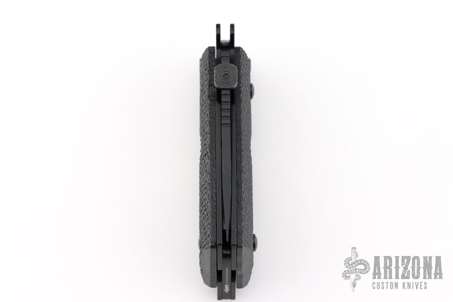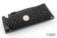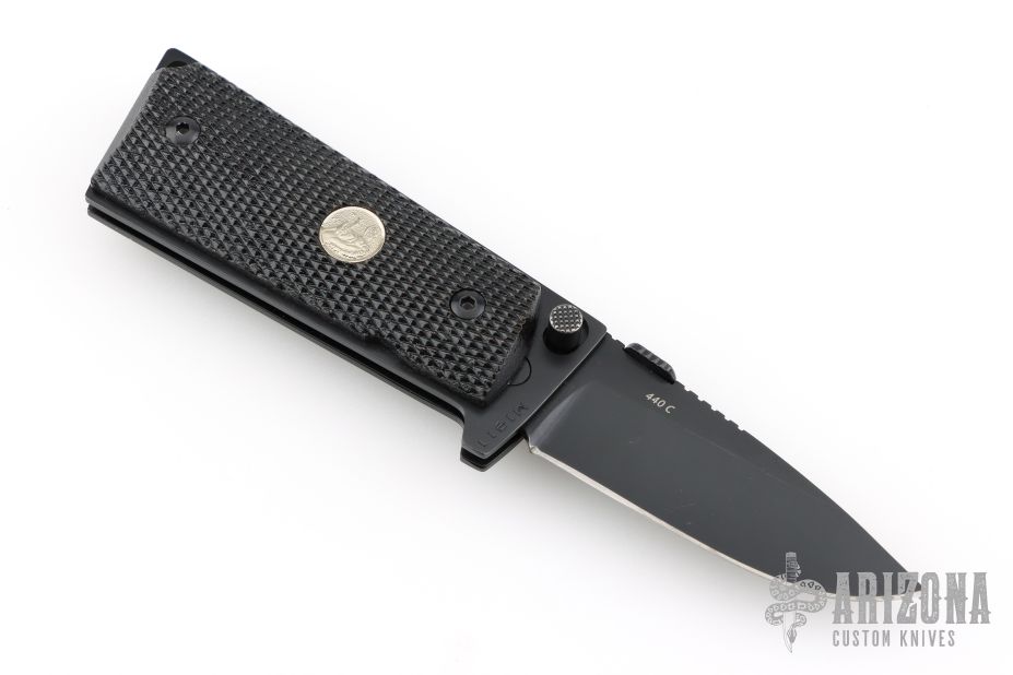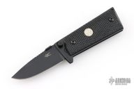 This knife by Ultimate Equipment features a black finished blade with notched thumbrest and a thumbdisc. The handle has checkered frn scales and a black stainless steel frame. Comes in a soft pouch. Excellent condition.