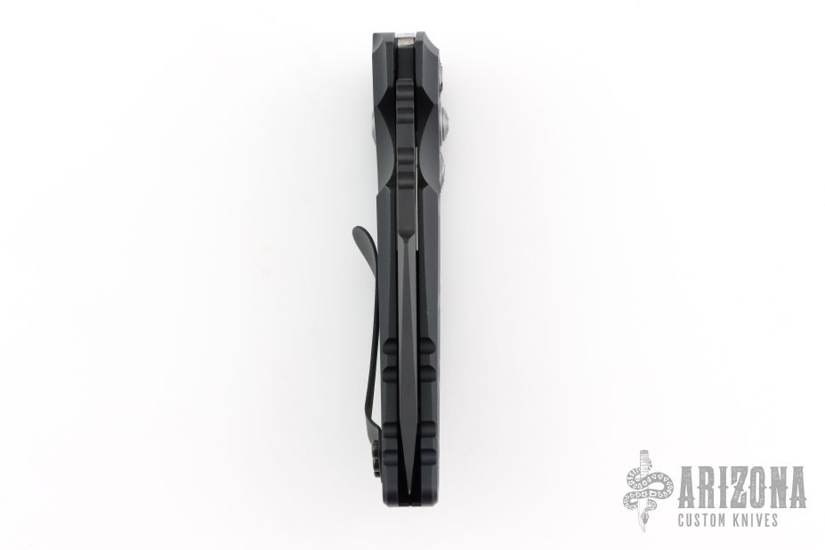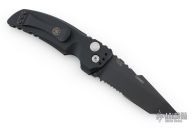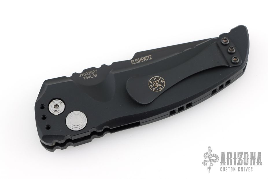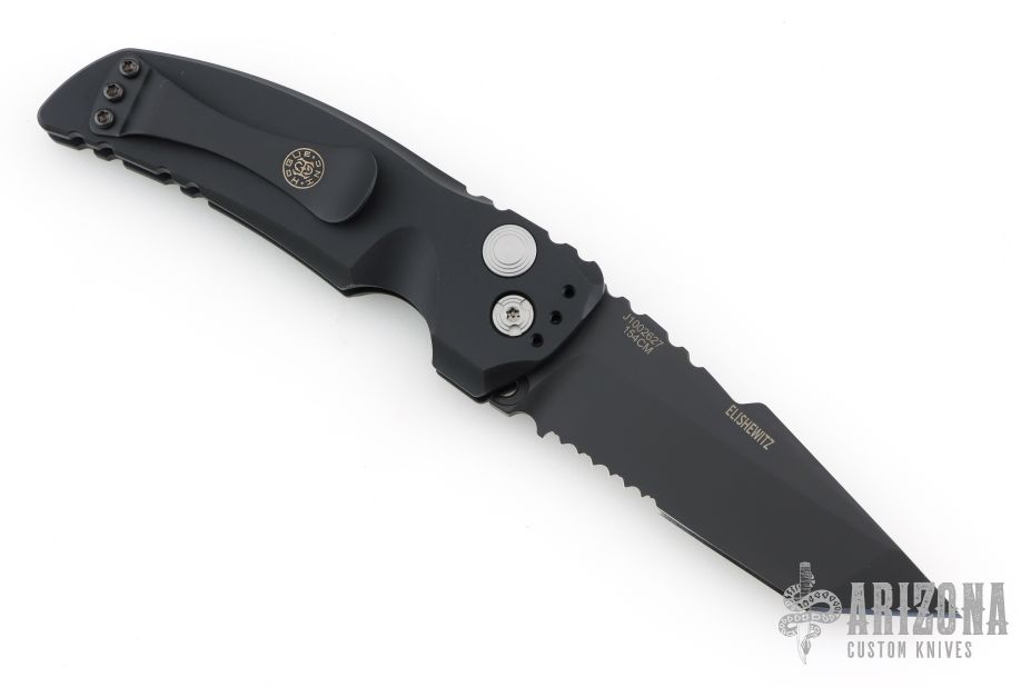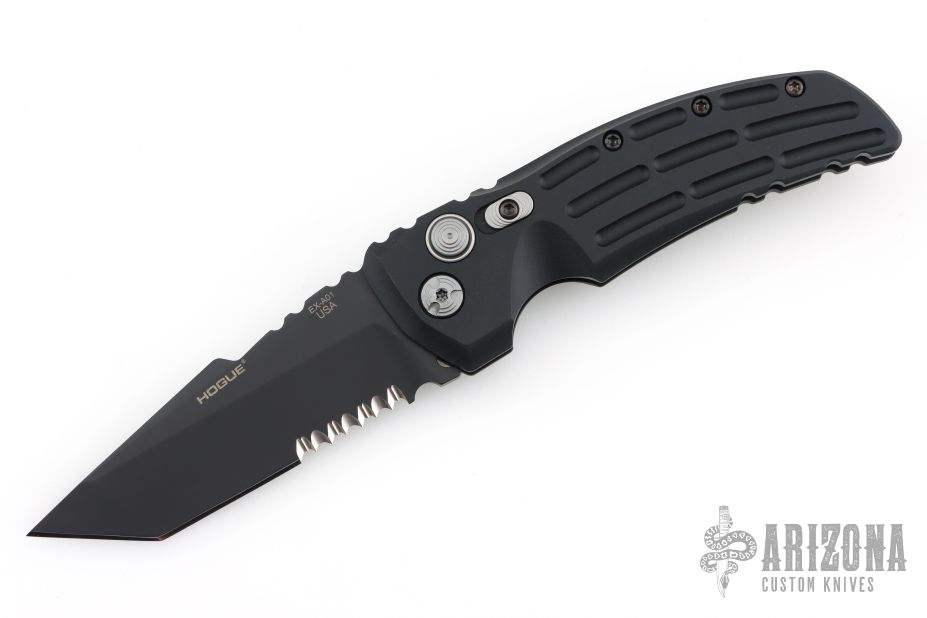 This EX-A01 by Hogue Knives is an Allen Elishewitz design, it features a black tanto partially serrated 154CM blade with notched thumbrest. The handle is black aluminum, tip up or down reversible black stainless steel clip. Has safety. Comes with original box and papers. Excellent condition.
