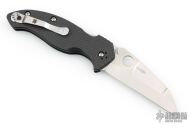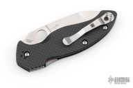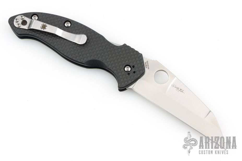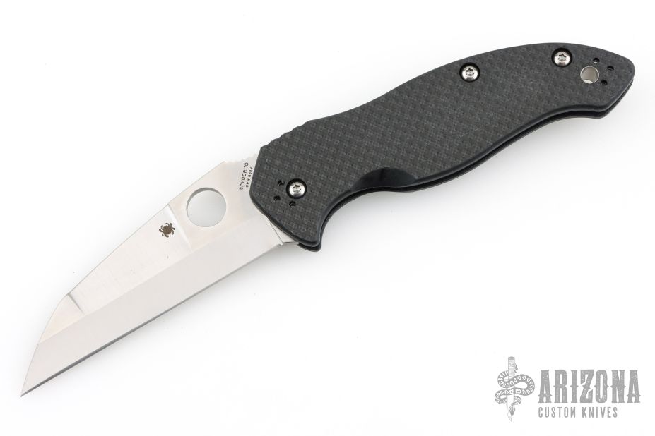 The Canis from Spyderco is a spectacle of a knife designed for everyday carry. The blade is made of CPM-S30V, and features a truly unique blade profile and grind. It has a Wharncliffe shape, a flat grind, and a ground out section which reduces weight, but full spine thickness near the tip to reinforce it. The handle is made of a carbon fiber/G-10 laminate with a gentle texture to hold it nicely in the hand.