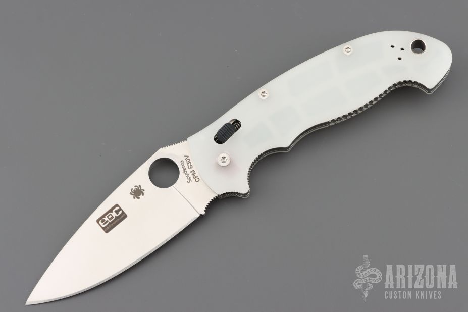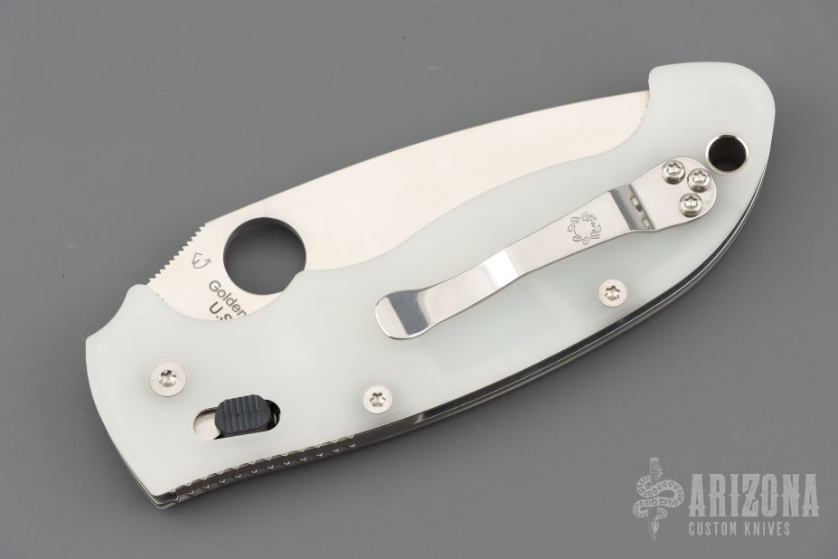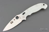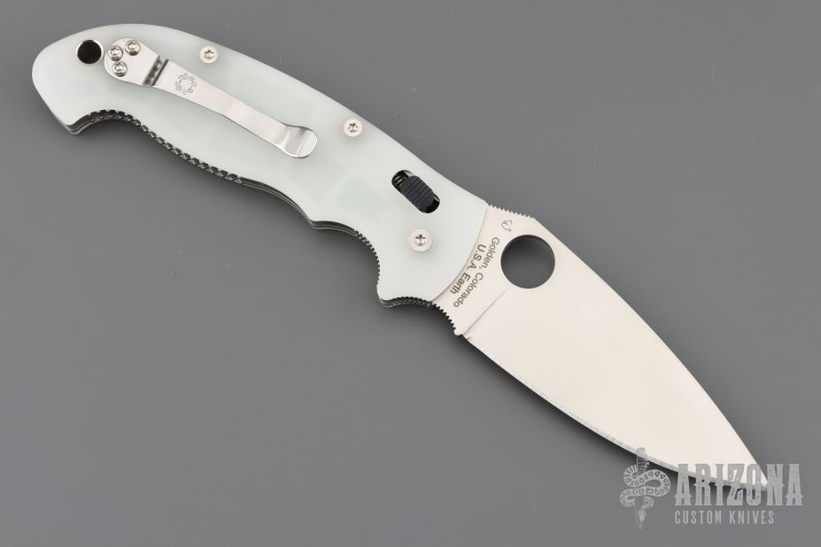 This Manix 2 by Spyderco has a satin finished drop point blade with thumbhole and notched thumbrest. Handle has glow in the dark scales over stainless steel liners, 2-way reversible tip up stainless steel clip, and lanyard tube pin. Comes with original box and papers. New condition.