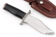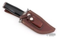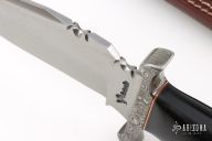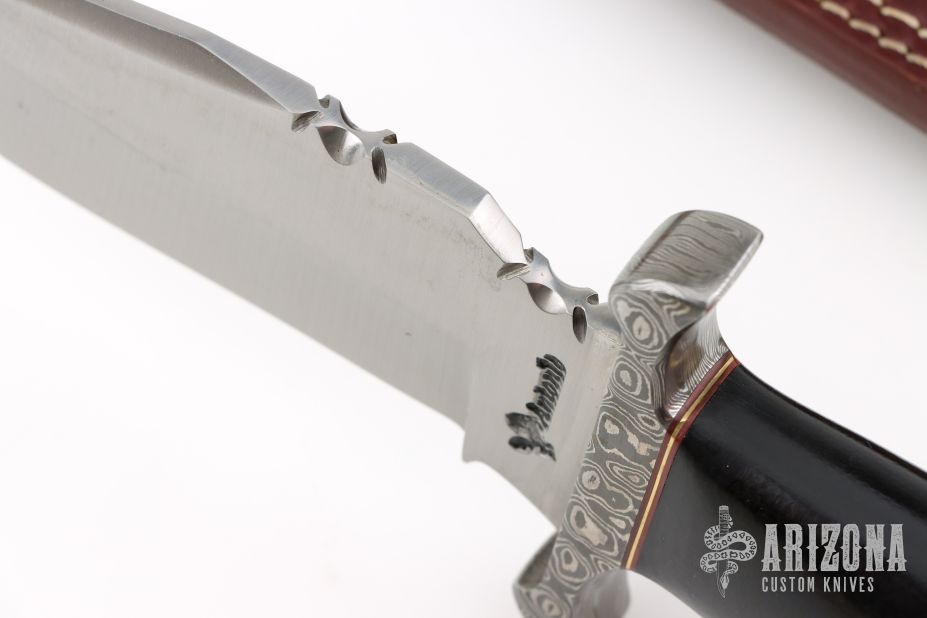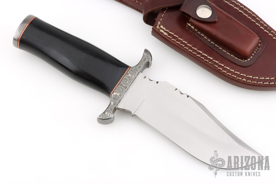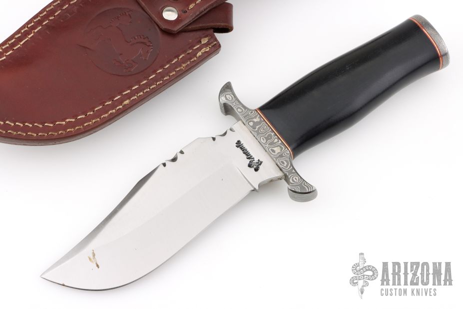 This knife features a satin finished clip point blade with false top edge, .208" blade stock and 1.777" blade stock, file worked blade spine, and hidden tang construction. The handle has Damascus guard and butt, dyed bone, micarta grip, and red/brass spacers. Comes with a brown leather sheath. Has some scratches and patina, good condition.