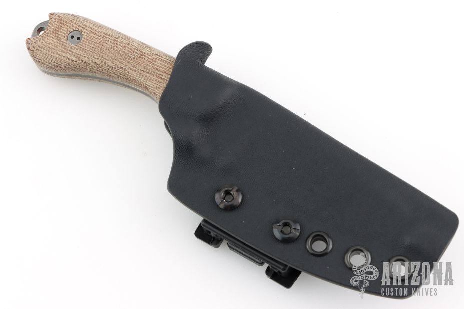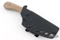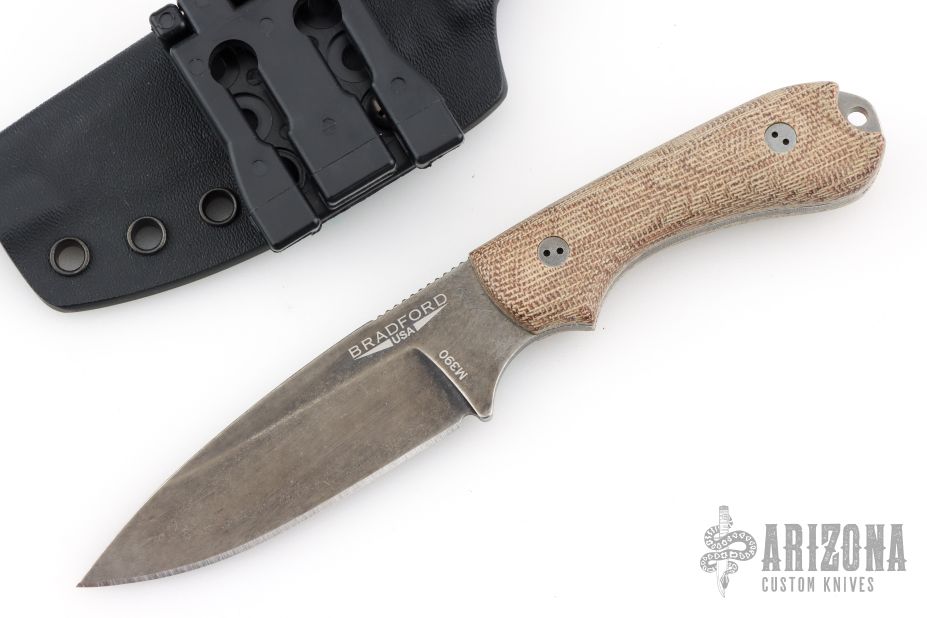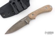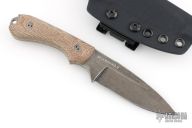 This Guardian 3.2 by Bradford Knives features a blackwashed blade with notched thumbrest, .141" blade stock and 1.146" blade depth. The handle has brown canvas micarta scales over full tang construction. Exposed tang pommel with lanyard hole. Includes a kydex sheath. Excellent condition.