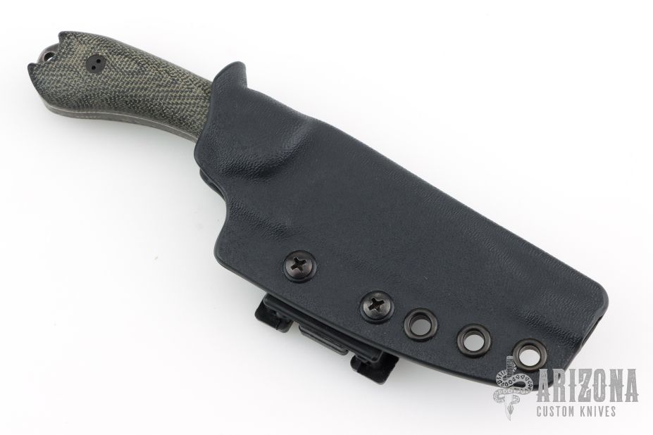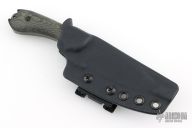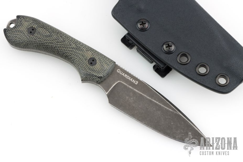 This Guardian3 by Bradford Knives features a blackwashed drop point blade with swedge and notched thumbrest, .142" blade stock and 1.085" blade depth. The handle has black canvas micarta scales over full tang construction. Exposed tang pommel with lanyard hole. Includes a kydex sheath. Excellent condition.