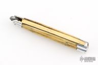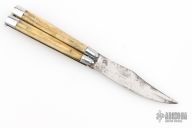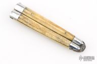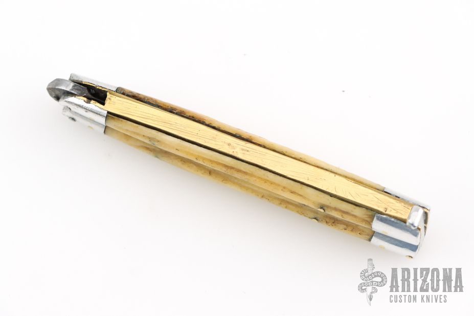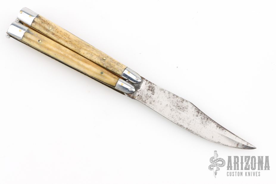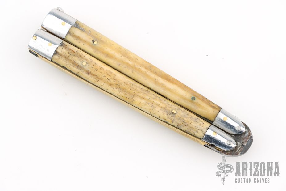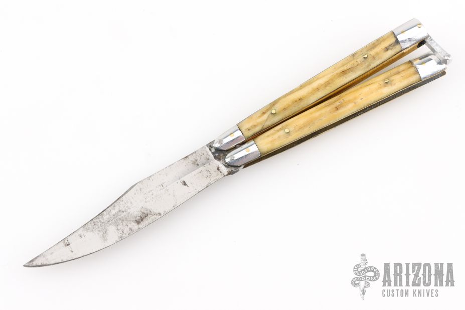 This balisong from the Philippines features a clip point blade with a satin finish. The handle has aluminum bolsters, front and rear and jigged bone scales, aluminum T-latch and brass liners/frame. Has scratches and patina, but that is normal for these, good condition.