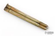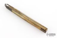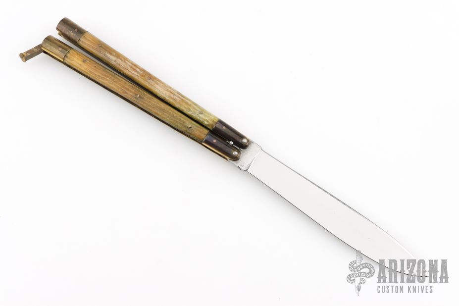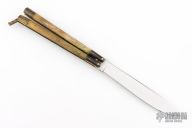 This balisong from the Philippines features a drop point blade with a satin finish. The handle has brass bolsters, front and rear and jigged bone scales, brass T-latch. Has scratches and patina, but that is normal for these, good condition.